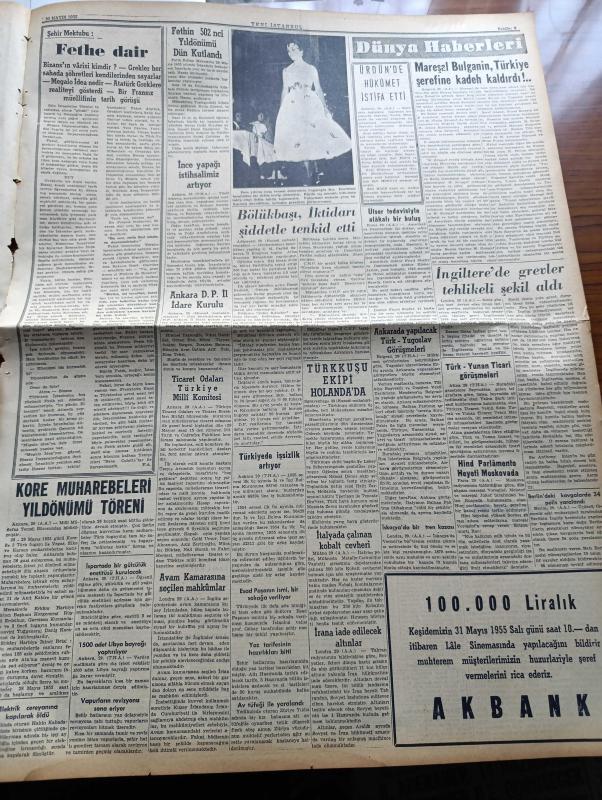 Yeni İstanbul Gazetesi - 30 Mayıs 1955 - Mustafa Nermi Köşe Yazısı - Rus Liderlerinin Belgrad'da Yeni Dostluk Nümayişleri - Kızıl Çin Esir Amerikalıları Bırakıyor Mu - İngiltere'de Grev Hayatı Aksattı - İstanbul Fethinin Yıldönümünü Kutlandı - Fluminense İstanbul'da Son Maçında Milli Takım Namzetlerini Yendi - Adapazarı'nda Osman Bölükbaşı'nın Konuşması - Kasım Gülek'in Muarızları Şimdiden Harekete Geçtiler - Pazar Konuşmaları Yazan Halide Edip Adıvar - Esirler Gölü Yazanlar Kemal Avan H. Avan Yazı Dizisi - İşçi Sigortaları Kongresi - Kapalıçarşı 5 Aya Kadar Açılacak - Türkkuşu Ekibi Hollanda'da - Ülser Tedavisiyle Alakalı Bir Buluş - Mareşal Bulganin Türkiye Şerefine Kadeh Kaldırdı - Saadet Bekçisi Yazan Zeliha Harun Yazı Dizisi - Ankara İstanbul İzmir Radyosu Programı - Marilyn Monroe'nun Mevkiine Göz Koyan Güzel Yıldız Jayne Mansfield - Eski Zamanlardan Beri Telsiz Vazifesini Gören Alet Tam Tam - Başpehlivan İrfan Atan - 9. Avrupa Basketbol Şampiyonası - Fatih Kupası Kürek Yarışları adlı eser, Kitap > Süreli Yayınlar > Gazeteler > Türkiye > Genel > Günlük kategorisinde İkinci El olarak satıştadır.