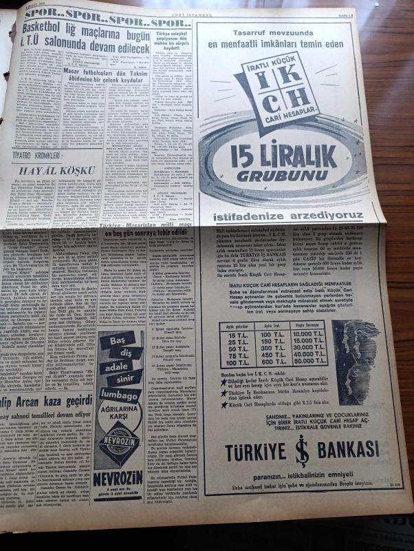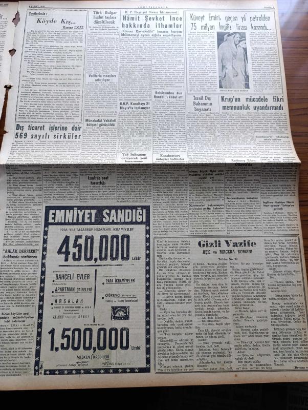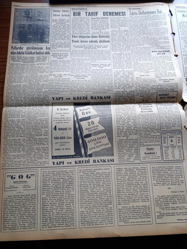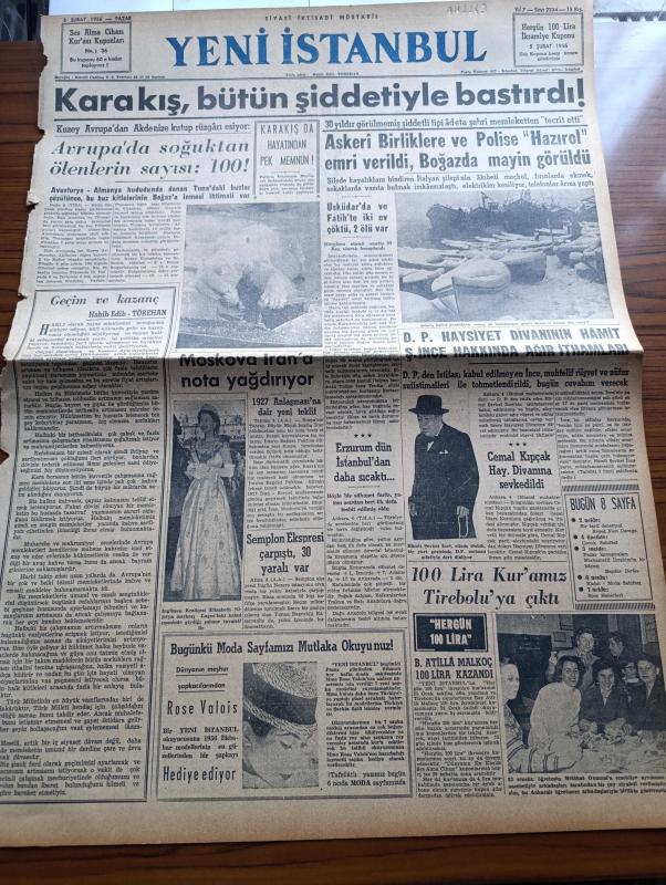 Yeni İstanbul Gazetesi - 5 Şubat 1956 - Karakış Bütün Şiddetiyle Bastırdı - Avrupa'da Soğuktan Ölenlerin Sayısı 100 - Askeri Birliklere Ve Polise Hazırol Emri Verildi Boğazda Mayın Görüldü - İngiltere Kraliçesi Elizabeth Şahane Tuvaleti İle - Demokrat Parti Haysiyet Divanının Hamit Şevket İnce Hakkında Ağır İthamları - Cemal Kıpçak Haysiyet Divanına Sevkedildi - Gog Yazan Giovanni Papini Yazı Dizisi - Belediye Zabıtası Polisten Ayrılacak - Yılan Hikayesine Dönen Elektrikli Trenin Arızası Yakında Çözülecek - Gizli Vazife Aşk Ve Macera Romanı Yazı Dizisi - Türk Bulgar Hudut Taşları Düzeltilecek - Ahlak Dersleri Hakkında Sözlü Soru - Kuveyt Emiri Şeyh Abdullah Geçen Yıl Petrolden 75 Milyon İngiliz Kazandı - Çocuk Sayfası - Pazar Konuşması Yazan Baydar Derler - Müzik Kronikleri Yazan Fikret Çiçekoğlu - Ankara İstanbul Radyosu Programı - 1956 Bahar Ve Yaz Kreasyonları - Basketbol Lig Maçlarına Bugün İTÜ Salonunda Devam Edilecek - Tiyatro Kronikleri - Macar Futbolcuları Taksim'de, Habib Edib Törehan tarafından kaleme alınmıştır. Yeni İstanbul Gazetesi - 5 Şubat 1956 - Karakış Bütün Şiddetiyle Bastırdı - Avrupa'da Soğuktan Ölenlerin Sayısı 100 - Askeri Birliklere Ve Polise Hazırol Emri Verildi Boğazda Mayın Görüldü - İngiltere Kraliçesi Elizabeth Şahane Tuvaleti İle - Demokrat Parti Haysiyet Divanının Hamit Şevket İnce Hakkında Ağır İthamları - Cemal Kıpçak Haysiyet Divanına Sevkedildi - Gog Yazan Giovanni Papini Yazı Dizisi - Belediye Zabıtası Polisten Ayrılacak - Yılan Hikayesine Dönen Elektrikli Trenin Arızası Yakında Çözülecek - Gizli Vazife Aşk Ve Macera Romanı Yazı Dizisi - Türk Bulgar Hudut Taşları Düzeltilecek - Ahlak Dersleri Hakkında Sözlü Soru - Kuveyt Emiri Şeyh Abdullah Geçen Yıl Petrolden 75 Milyon İngiliz Kazandı - Çocuk Sayfası - Pazar Konuşması Yazan Baydar Derler - Müzik Kronikleri Yazan Fikret Çiçekoğlu - Ankara İstanbul Radyosu Programı - 1956 Bahar Ve Yaz Kreasyonları - Basketbol Lig Maçlarına Bugün İTÜ Salonunda Devam Edilecek - Tiyatro Kronikleri - Macar Futbolcuları Taksim'de adlı eser Türkçe dilindedir.