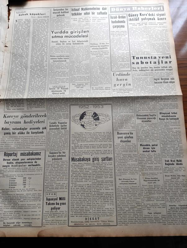 Yeni İstanbul Gazetesi - 6 Haziran 1952 - Mustafa Nermi - General Eisenhower Harbin Genişlemesini İstemiyor - Fransa'da Dün Kızıllar Yine Mağlup - Halk Partisinin Kanunsuz Aldığı Paralar Hakkında Yeni Bir Teklif - Amerika Sovyetleri Dün De Protesto Etti - Ankara'da Dost Yunan Kralını Karşılama Töreni Provası Yapıldı - Kraliçe Elizabeth 26. Yaş Gününü Kutladı - Maskeli Hakikat Yazan Deniz Albayı Tevfik İnci Yazı Dizisi - Araba Vapuru Seferleri Islah Ediliyor - Kore'ye Gönderilecek Bayram Hediyeleri - Yurtta Girişilen Sıtma Mücadelesi - Ingrid Bergman Eski Kocasını İtham Ediyor - İsrail Ürdün Hududunda Çarpışma- Yunanistan'da Kadınlar Seçimlere İştirak Edecek - Avrupa'nın En Tehlikeli Adamı Skorzeny Anlatıyor Mussolini'yi Nasıl Kaçırdım Yazı Dizisi - Kıbrıs Türkleri Arasında Yazan Fikret Adil Yazı Dizisi - Ramazanlık Köşe Yazısı - Sümerbank - Ziraat Bankası - Türk Ticaret Bankası - James Motosikletleri - Aga Radyo - Normag Traktör - Çapamarka - Orgeneral Holl Ankara'ya Geliyor, Habib Edib Törehan tarafından kaleme alınmıştır. Yeni İstanbul Gazetesi - 6 Haziran 1952 - Mustafa Nermi - General Eisenhower Harbin Genişlemesini İstemiyor - Fransa'da Dün Kızıllar Yine Mağlup - Halk Partisinin Kanunsuz Aldığı Paralar Hakkında Yeni Bir Teklif - Amerika Sovyetleri Dün De Protesto Etti - Ankara'da Dost Yunan Kralını Karşılama Töreni Provası Yapıldı - Kraliçe Elizabeth 26. Yaş Gününü Kutladı - Maskeli Hakikat Yazan Deniz Albayı Tevfik İnci Yazı Dizisi - Araba Vapuru Seferleri Islah Ediliyor - Kore'ye Gönderilecek Bayram Hediyeleri - Yurtta Girişilen Sıtma Mücadelesi - Ingrid Bergman Eski Kocasını İtham Ediyor - İsrail Ürdün Hududunda Çarpışma- Yunanistan'da Kadınlar Seçimlere İştirak Edecek - Avrupa'nın En Tehlikeli Adamı Skorzeny Anlatıyor Mussolini'yi Nasıl Kaçırdım Yazı Dizisi - Kıbrıs Türkleri Arasında Yazan Fikret Adil Yazı Dizisi - Ramazanlık Köşe Yazısı - Sümerbank - Ziraat Bankası - Türk Ticaret Bankası - James Motosikletleri - Aga Radyo - Normag Traktör - Çapamarka - Orgeneral Holl Ankara'ya Geliyor adlı eser Türkçe dilindedir.