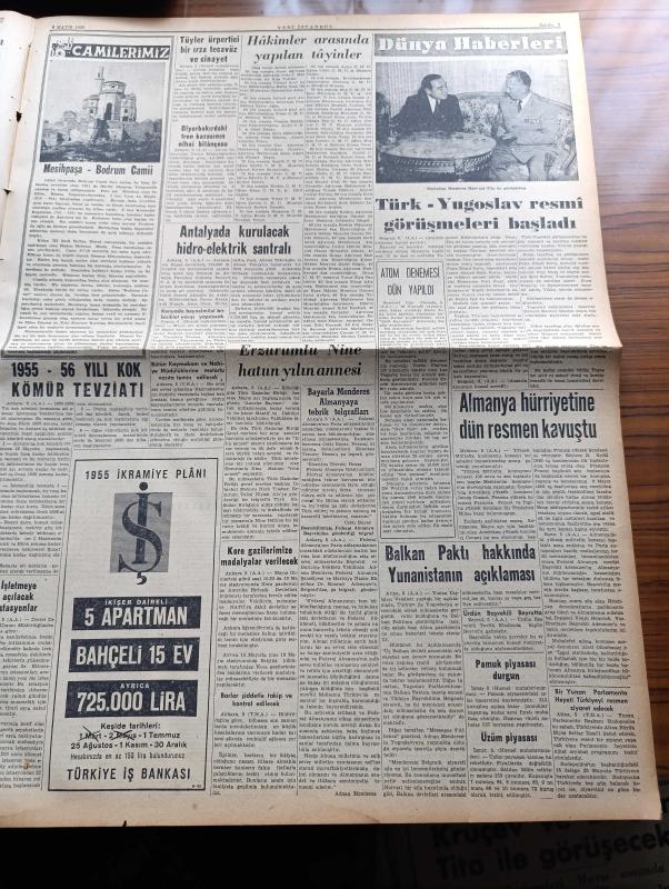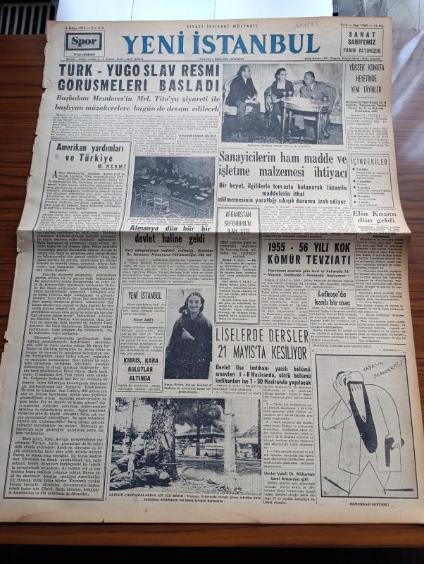 Yeni İstanbul Gazetesi - 6 Mayıs 1955 - Türk Yugoslav Resmi Görüşmeleri Başladı - Başbakan Adnan Menderes'in Mareşal Tito Ve Eşi İle Birlikte - 1955 56 Yılı Kok Kömür Tevziatı - Amerikalı Meşhur Rejisör Elia Kazan Dün Geldi - Lefkoşe'de Kanlı Bir Maç - Kürtaj Yolu İle İşlenen Cinayetlerle Mücadele - Notre Dame De Sion Kız Lisesi'nin Çanakkale Abidesine Yardımı - İ.E.E.T İdaresi 200 Otobüs Alıyor - Kore Gazilerimize Madalyalar Verilecek - Lübnan Ve Arap Diyarı Yazan Halide Edip Yazı Dizisi- Saadet Bekçisi Yazan Zeliha Harun Yazı Dizisi - İzmir Radyosu Programı - Ünlü Yıldız Audrey Hepburn - Münir Süleyman Çapanoğlu - Çocuk Sayfası - Karagümrük İstanbul Amatör Şampiyonu Oldu - 1 Mili Dört Dakikanın Altında Koşan İlk Atlet Doktor Roger Bannister - İspanya'da 200.000 Kişilik Stadyum - Avrupa Rekortmeni Macar İharoş - Galatasaray - Çapamarka adlı eser, Kitap > Süreli Yayınlar > Gazeteler > Türkiye > Genel > Günlük kategorisinde İkinci El olarak satıştadır.