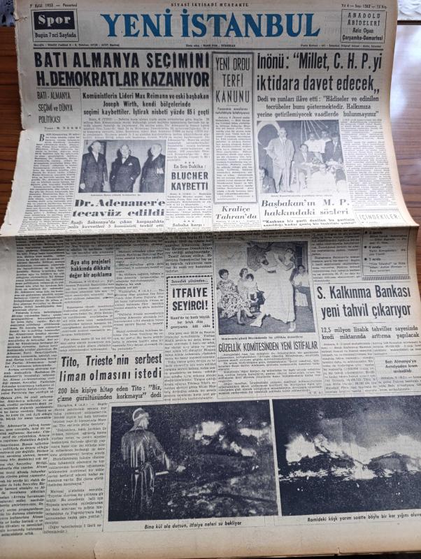 Yeni İstanbul Gazetesi - 7 Eylül 1953 - Batı Almanya Seçimi Ve Dünya Politikası Yazan Mustafa Nermi Köşe Yazısı - Batı Almanya Seçimini Hristiyan Demokratlar Kazandı - Dr. Adenauer'e Tecavüz Edildi - Yeni Ordu Terfi Kanunu - İsmet İnönü Millet CHP'yi İktidara Davet Edecek - Başbakan Adnan Menderes'in Millet Partisi Hakkında Sözleri - Sinai Kalkınma Bankası Yeni Tahvil Çıkarıyor - Mareşal Tito Trieste'nin Serbest Liman Olmasını İstedi - Halide Edip Adıvar'ın Romanı Döner Ayna Yazı Dizisi - Yabancı Sermayeyi Teşvik Yaşam Profesör Doktor Kerim Ömer Çağlar Köşe Yazısı - İdari İlimler Kongresi Şale Köşkünde Toplandı - Bursa'daki Belediye Seçimini Demokrat Parti Kazandı - Kore'de Dün 4 Türk Esiri Daha İade Edildi - Fenerbahçe Eskişehir'de 1 0 Galip - Denizde Cinayet Telif Hakkı Keystone Yazı Dizisi - Ankara İstanbul İzmir Radyosu Programı - Kore Mektupları - Güzel Bacak Müsabakası - Milyon Hırsızı Yazan S. G. Seeliger Yazı Dizisi - İran'da İngiliz Rus Rekabeti - Beşiktaş Beyoğluspor'u Yendi adlı eser, Kitap > Süreli Yayınlar > Gazeteler > Türkiye > Genel > Günlük kategorisinde İkinci El olarak satıştadır.
