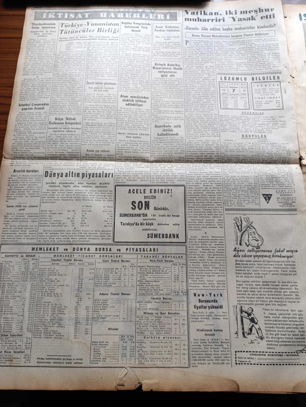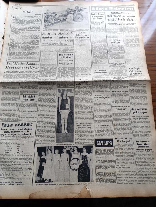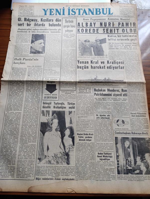 Yeni İstanbul Gazetesi - 7 Haziran 1952 - Mustafa Nermi - General Ridgway Kızıllara Sert Bir İhtarda Bulundu - Gelengül Tayfuroğlu Türkiye Güzellik Kraliçeliğine Seçildi - Albay Nuri Pamir Kore'de Şehit Oldu - Başbakan Adnan Menderes Rum Patrikhanesini Ziyaret Etti - Ürdün Kralı Tallal Yurduna Dönmek İstiyor - Maskeli Hakikat Yazan Deniz Albayı Tevfik İnci Yazı Dizisi - Hıfzıssıhha Enstitüsünün Bir Yıllık Çalışması - Yeni Maden Kanunu Meclise Veriliyor - İzmir'de Sahur Davulu Bir Mesele Oldu - Amiral Carney Karargâhının Yıldönümü - Bisiklet Yarışları - İran'da Ecnebi Okulları Yeni Talebe Alamayacak - İspanyollara Karşı Milli Takım Nasıl Tertipleniyor - Galatasaray Lille Takımıyla Oynuyor - Amerika'da Türk Delikanlıları - İstanbul'un En Eski İşyeri Balkapanı - Yeni Marlene Dietrich Kim - Rita Hayworth Sürekli Eş Değiştiriyor - Almanya Ve Bira - Kıbrıs Türkleri Arasında Yazan Fikret Adil Yazı Dizisi - İstanbul'un Büyük Bir Derdi Telefon - Demag Cereskalleri - BEA İngiliz Havayolları adlı eser, Kitap > Süreli Yayınlar > Gazeteler > Türkiye > Genel > Günlük kategorisinde İkinci El olarak satıştadır.