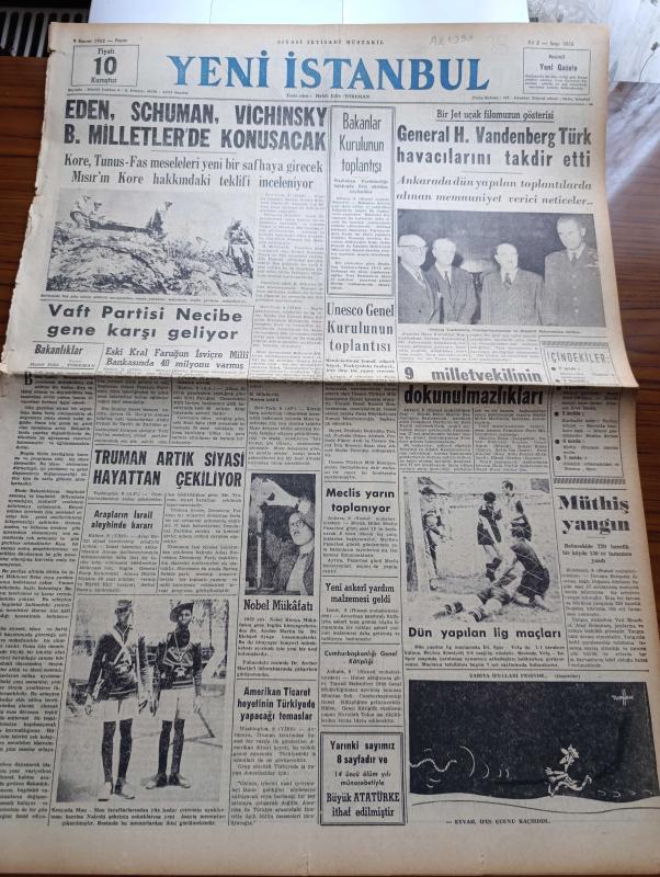 Yeni İstanbul Gazetesi - 9 Kasım 1952 - Eden Schuman Vichinsky Birleşmiş Milletler'de Konuşacak - Vaft Partisi Necibe Gene Karşı Geliyor - Truman Artık Siyasi Hayattan Çekiliyor - Arapların İsrail Aleyhindeki Kararı - UNESCO Genel Kurulunun Toplantısı - Marguerite Higgins'in Mektupları - Büyük Kardeşim Atatürk Anlatan Makbule Atadan - Denizlerin Efesi Gazi Umur Paşa Yazan Tevfik İnci Yazı Dizisi - NATO Komutan Muavini Türk Behçet Türkmen - Celal Bayar Lisesi Kadrosunun Hazırlıkları Tamamlandı - Kızıl Çin'in Maneviyatı Çok Zayıf - Stalin Ve Dünya Politikası - 12 Dilde Baskı Yapan Makine - Pazar Saatleri Yazan Bedii Faik - 1001 Gece Masalları Ali Baba İle Kırk Haramiler Çeviren Reşad Nuri Darago - Radyolar - Karikatür Nedir - Üç Karılı Hasan Ağa Yazan Mediha Berkes - Vefa İstanbulspor'la Beraber - Beykoz Emniyet'i Yendi - Minerva Dikiş Makinesi - Gripin - Çapamarka adlı eser, Kitap > Süreli Yayınlar > Gazeteler > Türkiye > Genel > Günlük kategorisinde İkinci El olarak satıştadır.