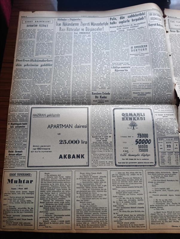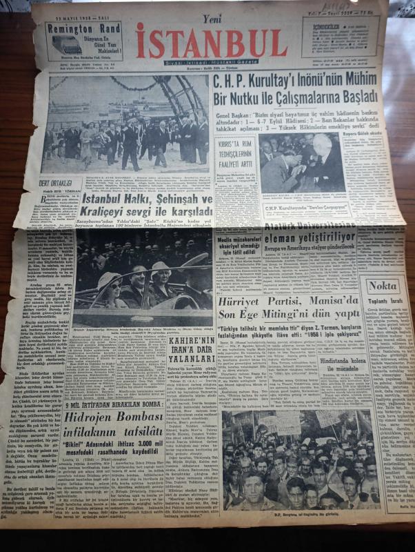 Yeni İstanbul Gazetesi - Turkish Newspaper - 22 Mayıs 1956 - dert ortaklığı yazan Habib Edib Törehan Başmakale - İran Şahı İstanbul'a ayak basarken fotoğraf - majestte imparatoriçe Süreyya beraberinde başvekil Adnan Menderes ve bayan Gökay olduğu halde otomobille beyoğlu'ndan geçerken fotoğraf - CHP kurultayı İsmet İnönü'nün mühim bir nutku ile çalışmalarına başladı - Kıbrıs'ta rum tedhişçilerin faaliyeti arttı - Atatürk üniversitesine eleman yetiştiriliyor - Hürriyet Partisi Manisa'da son Ege mitingini dün yaptı - Demokrat Parti Bergama mitinginden bir fotoğraf - hidrojen bombası infilakının tafsilatı - toplantı israfı yazan Refik Halit Karay - Muhtar yazan Fikret Arıt Yazı Dizisi - imparatoriçe Süreyya'nın hayatı Derleyen Nezihe Türkkan Yazı Dizisi - Stalin'in kızı Svetlana Moskova'da bir kabul resmine iştirak etti - köy kadınlarından yükselen ses yazan Tarhan Toker - Çayeli Çay fabrikası işletmeye açılıyor - Ankara İstanbul Radyosu Programı - Dünya Kupası Güreş Şampiyonası, Habib Edib Törehan tarafından kaleme alınmıştır. Yeni İstanbul Gazetesi - Turkish Newspaper - 22 Mayıs 1956 - dert ortaklığı yazan Habib Edib Törehan Başmakale - İran Şahı İstanbul'a ayak basarken fotoğraf - majestte imparatoriçe Süreyya beraberinde başvekil Adnan Menderes ve bayan Gökay olduğu halde otomobille beyoğlu'ndan geçerken fotoğraf - CHP kurultayı İsmet İnönü'nün mühim bir nutku ile çalışmalarına başladı - Kıbrıs'ta rum tedhişçilerin faaliyeti arttı - Atatürk üniversitesine eleman yetiştiriliyor - Hürriyet Partisi Manisa'da son Ege mitingini dün yaptı - Demokrat Parti Bergama mitinginden bir fotoğraf - hidrojen bombası infilakının tafsilatı - toplantı israfı yazan Refik Halit Karay - Muhtar yazan Fikret Arıt Yazı Dizisi - imparatoriçe Süreyya'nın hayatı Derleyen Nezihe Türkkan Yazı Dizisi - Stalin'in kızı Svetlana Moskova'da bir kabul resmine iştirak etti - köy kadınlarından yükselen ses yazan Tarhan Toker - Çayeli Çay fabrikası işletmeye açılıyor - Ankara İstanbul Radyosu Programı - Dünya Kupası Güreş Şampiyonası adlı eser Türkçe dilindedir.