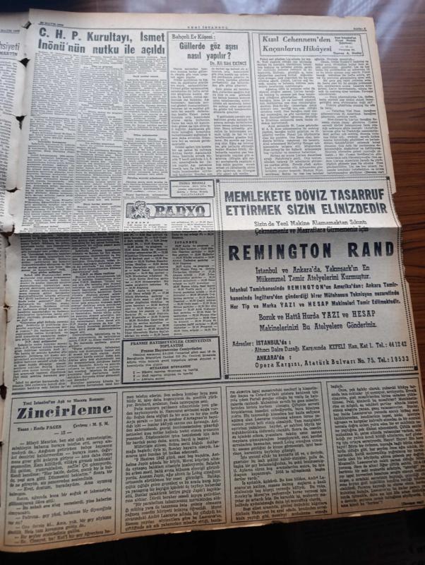 Yeni İstanbul Gazetesi - Turkish Newspaper - 22 Mayıs 1956 - dert ortaklığı yazan Habib Edib Törehan Başmakale - İran Şahı İstanbul'a ayak basarken fotoğraf - majestte imparatoriçe Süreyya beraberinde başvekil Adnan Menderes ve bayan Gökay olduğu halde otomobille beyoğlu'ndan geçerken fotoğraf - CHP kurultayı İsmet İnönü'nün mühim bir nutku ile çalışmalarına başladı - Kıbrıs'ta rum tedhişçilerin faaliyeti arttı - Atatürk üniversitesine eleman yetiştiriliyor - Hürriyet Partisi Manisa'da son Ege mitingini dün yaptı - Demokrat Parti Bergama mitinginden bir fotoğraf - hidrojen bombası infilakının tafsilatı - toplantı israfı yazan Refik Halit Karay - Muhtar yazan Fikret Arıt Yazı Dizisi - imparatoriçe Süreyya'nın hayatı Derleyen Nezihe Türkkan Yazı Dizisi - Stalin'in kızı Svetlana Moskova'da bir kabul resmine iştirak etti - köy kadınlarından yükselen ses yazan Tarhan Toker - Çayeli Çay fabrikası işletmeye açılıyor - Ankara İstanbul Radyosu Programı - Dünya Kupası Güreş Şampiyonası adlı eser, Kitap > Süreli Yayınlar > Gazeteler > Türkiye > Genel > Günlük kategorisinde İkinci El olarak satıştadır.