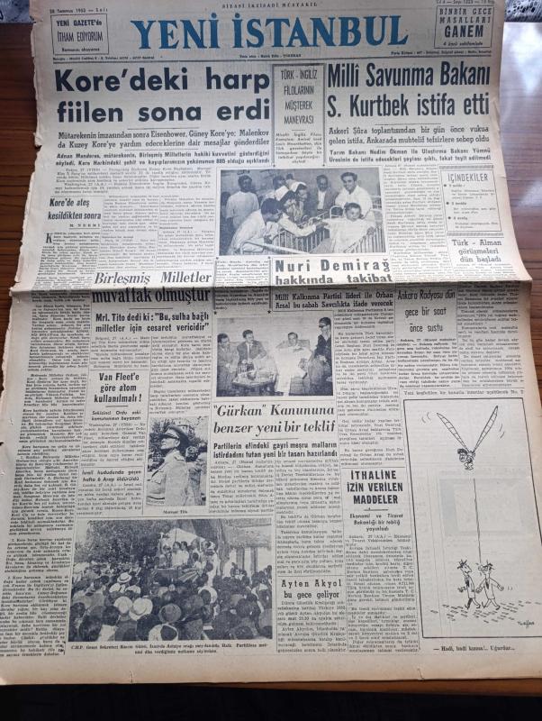 Yeni İstanbul Gazetesi - Turkish Newspaper - 28 Temmuz 1953 - Kore'de ateş kesildikten sonra yazan Mustafa Nermi Başmakale - Kore'deki harp fiilen sona erdi - Türk İngiliz filolarının müşterek manevrası - Milli Savunma Bakanı Seyfi Kurtbek istifa etti - milli kalkınma Partisi lideri Nuri Demirağ hakkında takibat - Gürkan kanununa benzer yeni bir teklif - Türkiye 1953 güzeli Ayten Akyol bu gece geliyor - Ankara radyosu dün gece bir saat önce sustu - Mareşal Tito Kore konusunda Birleşmiş Milletler muvaffak olmuştur dedi - Amerikan eski ordu komutanı Van Fleet'e göre atom kullanılmalı - döner ayna yazan Halide Edip Adıvar Yazı Dizisi - Adnan Menderes'in her an diktatörlüğe gittiği iddiası - Kore harbinde Türkiye 885 şehit ve kayıp verdi - Sabiha Gökçen Amerika'da - Ankara İstanbul İzmir Radyosu Programı - yeni bir gübre Gramlaxmi - Monte carlo'nun sahibi olan adam Onassis - Beria'ya ne oldu fotoğraflar - Malenkov'un Ruhi tahlili - büyük röportaj serisi İslam memleketleri Fikret Adil adlı eser, Kitap > Süreli Yayınlar > Gazeteler > Türkiye > Genel > Günlük kategorisinde İkinci El olarak satıştadır.