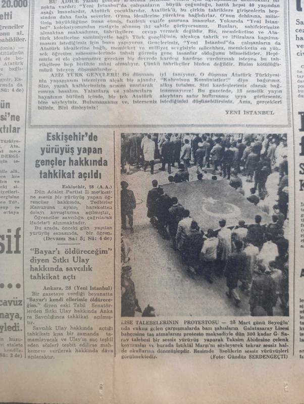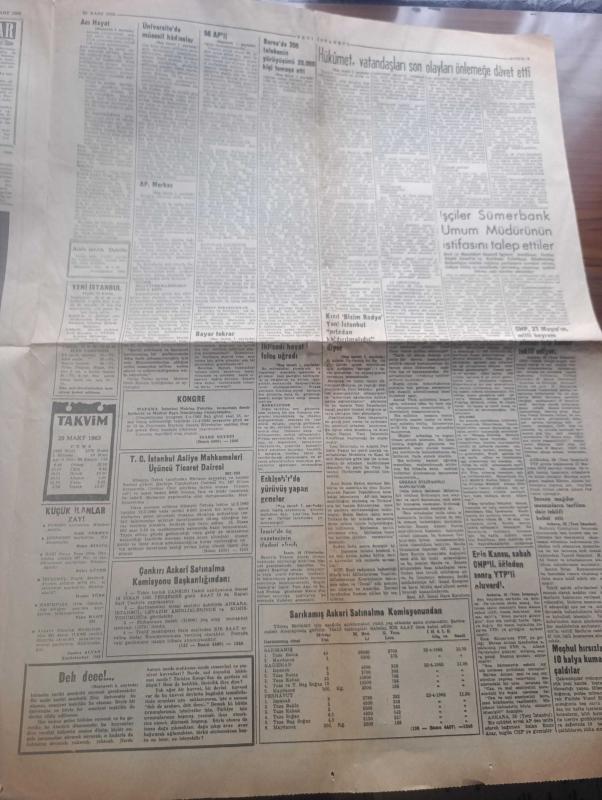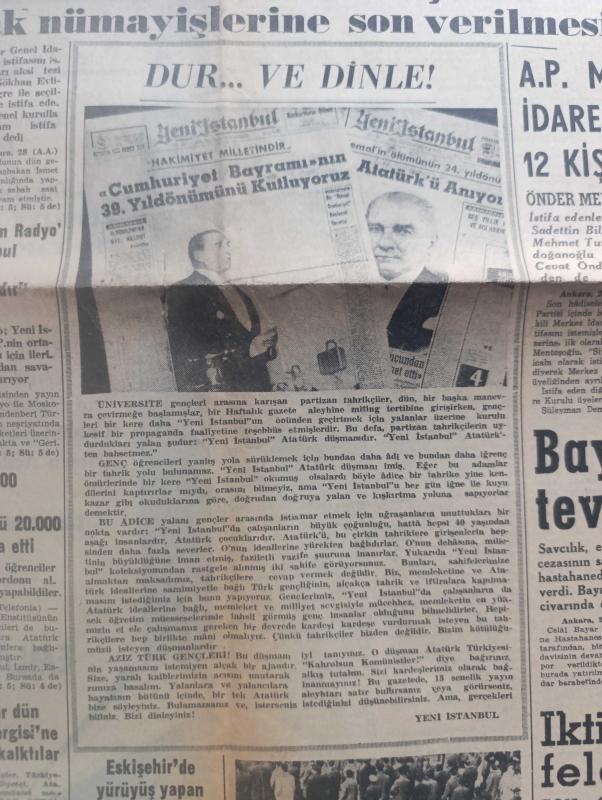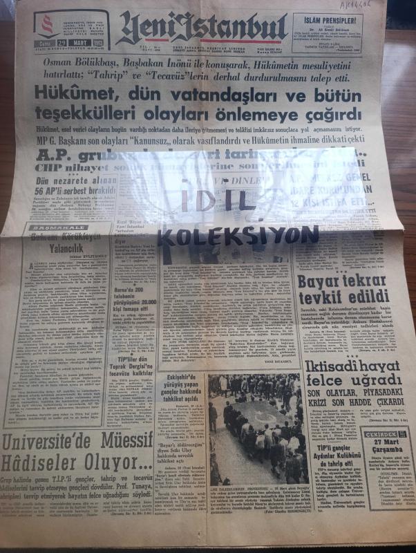 Yeni İstanbul Gazetesi - Turkish Newspaper - 29 Mart 1963 - buhranı körükleyen yalancılık yazan Gökhan Evliyaoğlu Başmakale - hükümet Dün vatandaşları ve bütün teşekkülleri olayları önlemeye çağırdı - Osman Bölükbaşı Başbakan İsmet İnönü ile konuşarak hükümetin mesuliyetini hatırlattı - Adalet Partisinde grubunda da sert tartışmalar oldu - Adalet Partisi merkez genel idare kurulundan 12 kişi istifa etti - Celal Bayar tekrar tevkif edildi - Kızıl bizim radyo yeni İstanbul ortadan kaldırılmalıdır diyor - Bursa'da 200 talebenin yürüyüşünü 20.000 kişi temaşa etti - TİP'liler Dün Toprak dergisine tecavüze kalktılar - Celal Bayar öldüreceğim diyen Sıtkı Ulay hakkında savcılık tahkikat açtı - TİP'li gençler Aydınlar kulübünü de tahrip etti - günün yazısı ökse yazan Safiye Erol - dolapdere'de 2 ihtiyar açlıktan öldü - İtalya ve dünya futbolunun bir numaralı otoritesi Vittorio Pozzo maçı değil İstanbul'u beğendim dedi - Alfredo Tonilo Can Bartu Metin oktay'dan çok büyük bir futbol yıldızıdır, Hami Tezkan tarafından kaleme alınmıştır. Yeni İstanbul Gazetesi - Turkish Newspaper - 29 Mart 1963 - buhranı körükleyen yalancılık yazan Gökhan Evliyaoğlu Başmakale - hükümet Dün vatandaşları ve bütün teşekkülleri olayları önlemeye çağırdı - Osman Bölükbaşı Başbakan İsmet İnönü ile konuşarak hükümetin mesuliyetini hatırlattı - Adalet Partisinde grubunda da sert tartışmalar oldu - Adalet Partisi merkez genel idare kurulundan 12 kişi istifa etti - Celal Bayar tekrar tevkif edildi - Kızıl bizim radyo yeni İstanbul ortadan kaldırılmalıdır diyor - Bursa'da 200 talebenin yürüyüşünü 20.000 kişi temaşa etti - TİP'liler Dün Toprak dergisine tecavüze kalktılar - Celal Bayar öldüreceğim diyen Sıtkı Ulay hakkında savcılık tahkikat açtı - TİP'li gençler Aydınlar kulübünü de tahrip etti - günün yazısı ökse yazan Safiye Erol - dolapdere'de 2 ihtiyar açlıktan öldü - İtalya ve dünya futbolunun bir numaralı otoritesi Vittorio Pozzo maçı değil İstanbul'u beğendim dedi - Alfredo Tonilo Can Bartu Metin oktay'dan çok büyük bir futbol yıldızıdır adlı eser Türkçe dilindedir.