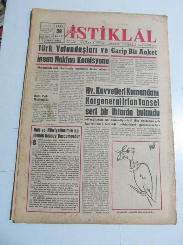 Yeni İstiklal Gazetesi / Sayı: 59 / 2 Şubat 1962 / Hv. Kuvvetleri Kumandanı Korgeneral İrfan Tansel Sert Bir İhtarda Bulundu, 3 yıl önce satışa sunulmuştur.