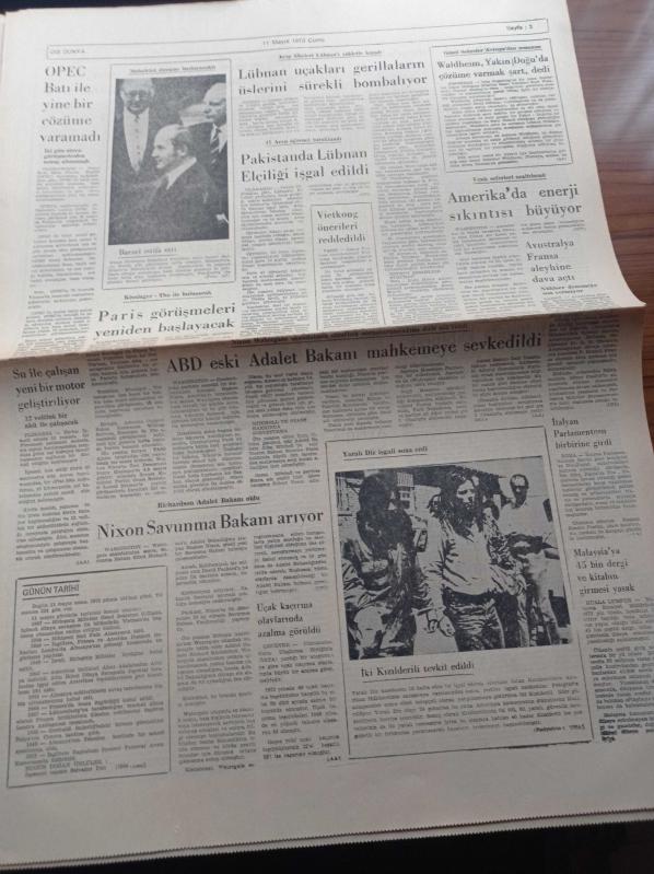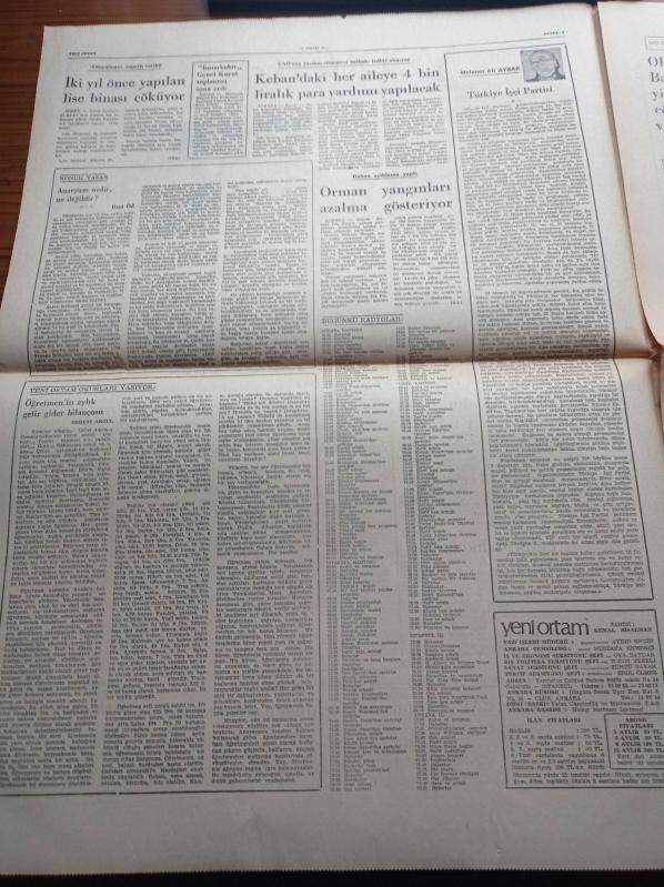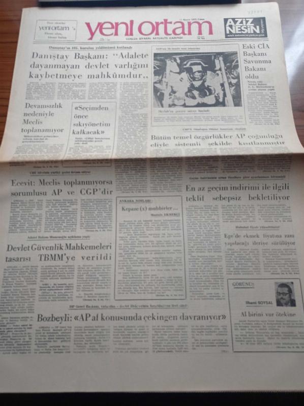 Yeni Ortam Gazetesi - 11 Mayıs 1973 - Kemal Bisalman - İlhami Soysal - Mustafa Ekmekçi - Mehmet Ali Aybar - Rıza Güven - Fakir Baykurt - Hasan İzzettin Dinamo - Ara Güler Fotoğrafçı Bir Sanatçı Fotoğraf da Bir Sanattır - Eski CIA Başkanı Savunma Bakanı Oldu - Başbakan Yardımcısı Kemal Satır - Devlet Güvenlik Mahkemeleri Tasarısı TBMM'ye Verildi - Yaralı Diz İşgali Sona Erdi - OPEC Batı İle Yine Bir Çözüme Varamadı adlı eser, Kitap > Süreli Yayınlar > Gazeteler kategorisinde İkinci El olarak satıştadır.