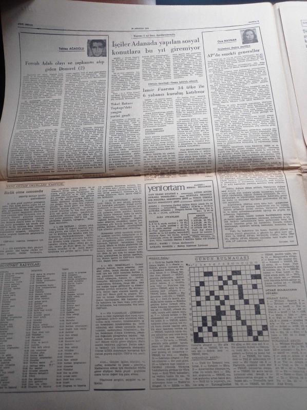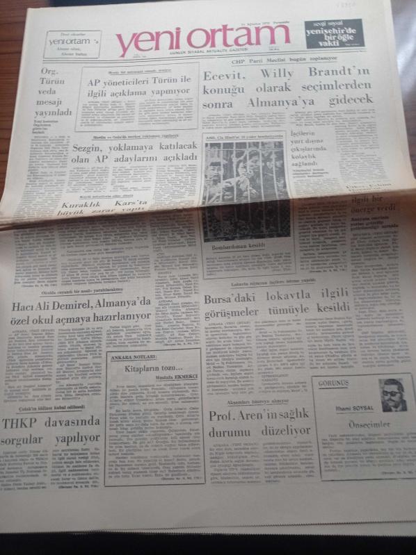 Yeni Ortam Gazetesi - 16 Ağustos 1973 - İlhami Soysal - Sevgi Soysal - Kemal Bisalman - Mustafa Ekmekçi - Tektaş Ağaoğlu - Oya Baydar - İsmail Necati - Y. Kenan Karacanlar - Ekrem Gökçe - Muzaffer Buyrukçu Trafik Kazasında Yaralandı - Nejat Uygur Tiyatrosu - Üç Silahşörler - Adalet Partisi Yöneticileri Faik Türün İle İlgili Açıklama Yapmıyor - Hacı Ali Demirel Almanya'da Özel Okul Açmaya Hazırlanıyor - THKP Davasında Sorgular Yapılıyor - Profesör Sadun Aren'in Sağlık Durumu Düzeliyor - Bülent Ecevit adlı eser, Kitap > Süreli Yayınlar > Gazeteler kategorisinde İkinci El olarak satıştadır.