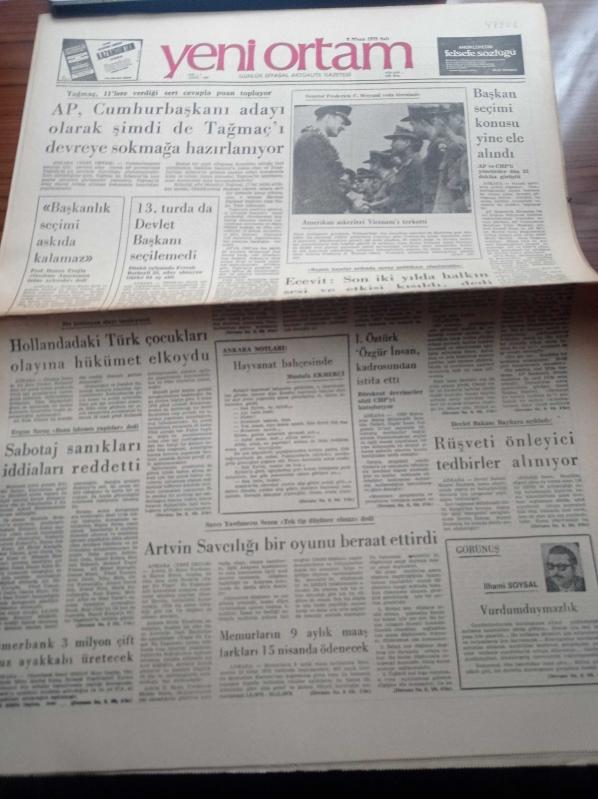 Yeni Ortam Gazetesi - 3 Nisan 1973 - Tarık Dursun K - Emil Galip Sandalcı - İlhami Soysal - Kemal Bisalman - Mustafa Ekmekçi - Selahattin Hilav - Hasan İzzettin Dinamo - Murat Can - Yücel Kıyılı - Picasso - Ülkü Tamer - Harbiye Tiyatrosu - Amerikan Askerleri Vietnam'ı Terk Etti - Adalet Partisi Cumhurbaşkanı Adayı Olarak Şimdi De Memduh Tağmaç'ı Devreye Sokmağa Hazırlanıyor - Bülent Ecevit - Ferruh Bozbeyli- Henry Kissinger Capkinlığa Devam Ediyor adlı eser Türkçe dilindedir.