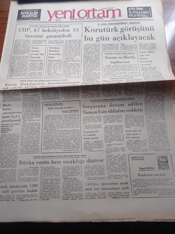 Yeni Ortam Gazetesi - 4 Aralık 1973- Ali Sirmen - Oya Baydar - Kemal Bisalman - Fenerbahçeli Cemil Turan - Beşiktaş Kulübü Genel Sekreteri Cengiz Kap - Serbest Güreş Takımı - Hasan İzzettin Dinamo - Şair Rıfat Ilgaz Artık Gazetelerde Fıkra Yazmayacak - Devekuşu Kabare Tiyatrosu - Fahri Korutürk - Sorgusuna Devam Edilen Numan Esin İddiaları Reddetti - CHP 67 Belediyeden 33 Tanesini Garantiledi - Ahmet İsvan adlı eser, Kitap > Süreli Yayınlar > Gazeteler kategorisinde İkinci El olarak satıştadır.