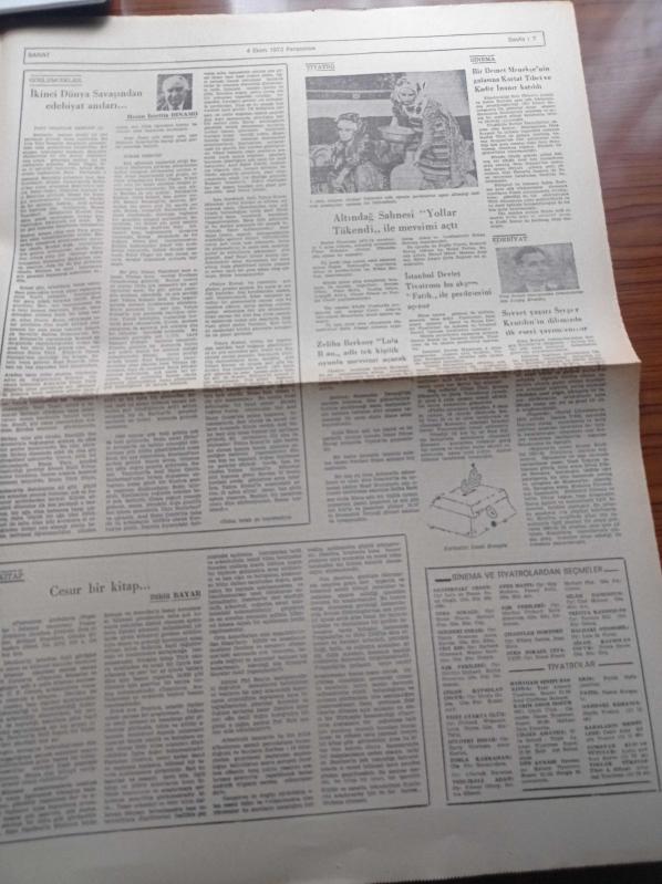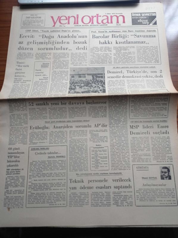 Yeni Ortam Gazetesi - 4 Ekim 1973 - Kemal Bisalman - İlhami Soysal - Tektaş Ağaoğlu - Mustafa Ekmekçi - Oya Baydar - Feyzi Yüksel - Hasan İzzettin Dinamo - Bir Demet Menekşe'nin Galasına Kartal Tibet Ve Kadir İnanır Katıldı - Türkiye Barolar Birliği Genel Başkanı Profesör Faruk Erem - Bülent Ecevit - Milli Selamet Partisi Genel Başkanı Süleyman Arif Emre - Türkiye İşçi Partisi adlı eser, Kitap > Süreli Yayınlar > Gazeteler kategorisinde İkinci El olarak satıştadır.