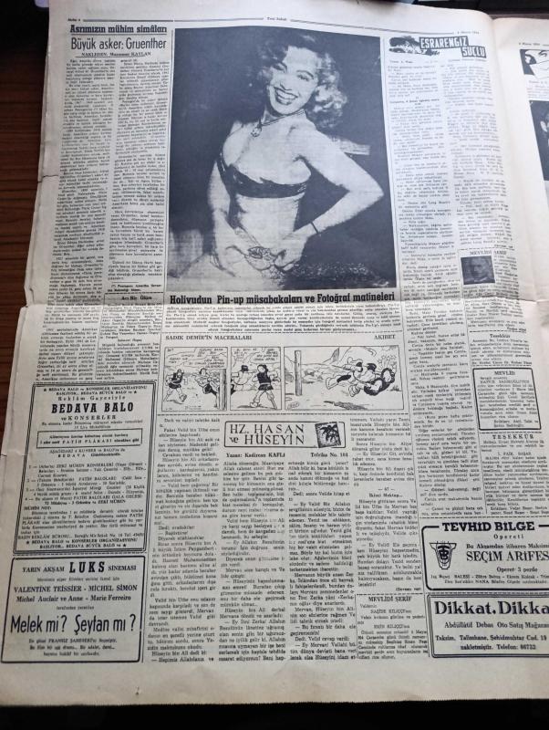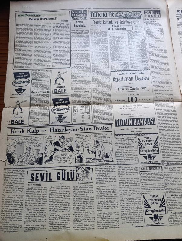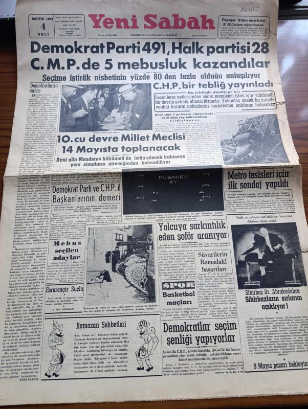 Yeni Sabah Gazetesi - 4 Mayıs 1954 - Demokratların Zaferi Yazı Yeni Sabah Gazetesi - Demokrat Parti 491 Halk Partisi 28 Cumhuriyetçi Millet Partisi De 5 Mebusluk Kazandılar - 10. Devre Millet Meclisi 14 Mayıs'ta Toplanacak - Mecidiyeköy İle Yenikapı Arasında Metro Tesisleri İçin İlk Sondaj Yapıldı - Basketbol Maçları - Ramazan Sohbetleri - Demokrat Parti Ve CHP İl Başkanlarının Demeci - Sevil Gülü Yazan Earl Lordrey Yazı Dizisi - Kırık Kalp Hazırlayan Stan Drake Çizgi Roman - Yersiz Kuruntu Ve Üzüntüye Çare Yazan A.J. Cronin - Hacivat İle Karagöz - Amerikan Dışişleri Bakanı John Foster Dulles'ın İstifa Edeceği Haberi Yalanlandı - Pulitzer Mükafatı - Hollywood'un Pin Müsabakaları Ve Fotoğraf Matineleri - Hz. Hasan Ve Hüseyin Yazan Kadircan Kaflı - Büyükşehir Asker Gruenther Yazan Muammer Kaylan - Lale Oraloğlu Puro Tuvalet Sabunu Kullanıyorum Diyor - Güller Açınca Çizgi Roman - Gripin - Vel Çit Yağlı Krem Saç Boyası - Mobilgas adlı eser, Kitap > Süreli Yayınlar > Gazeteler > Türkiye > Genel > Günlük kategorisinde İkinci El olarak satıştadır.