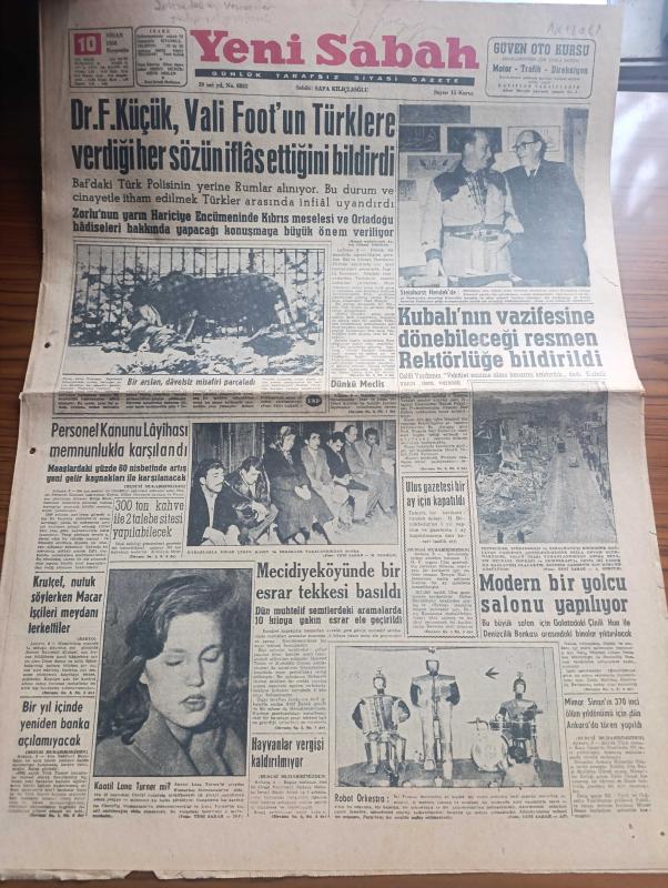 Yeni Sabah Gazetesi - Turkish Newspaper - 10 Nisan 1958 - Doktor Fazıl Küçük Vali Foot'un Türklere verdiği her sözün iflas ettiğini bildirdi - bir aslan davetsiz misafiri parçaladı fotoğraf - Müslüman olan Alman alimi Nurettin Steinhorst hendek'te Fotoğrafı - Vezneciler Şehzadebaşı ve saraçhaneyi birbirine bağlayan caddenin genişletilmesi fotoğraf - Mecidiyeköy'ünde bir esrar tekkesi basıldı fotoğraf - Katil Lana Turner Fotoğrafı - modern bir yolcu salonu için galata'daki Çinili Han ile denizcilik Bankası arasındaki binalar yıkılacak - Mimar Sinan'ın 370. Ölüm yıldönümü anması için Ankara'da tören - İstanbul sinema tiyatro programı - hazreti Muhammed'in köyünde yazan Nezihe Araz Yazı Dizisi - Ramazan köşesi - Kezban Taksim sinemasında - Grace Kelly ve Rainier bir kız çocuk daha istiyorlar fotoğraf - Hayk Hammer çizen Oğuz Aral - Cafer ile Hürmüz karikatür çizen Altan Erbulak - genç takımımız Romanya ile 0 0 berabere kalarak elendi - Fenerbahçe Blau Weiss'la 20 Nisan'da karşılaşacak, Safa Kılıçlıoğlu tarafından kaleme alınmıştır. Yeni Sabah Gazetesi - Turkish Newspaper - 10 Nisan 1958 - Doktor Fazıl Küçük Vali Foot'un Türklere verdiği her sözün iflas ettiğini bildirdi - bir aslan davetsiz misafiri parçaladı fotoğraf - Müslüman olan Alman alimi Nurettin Steinhorst hendek'te Fotoğrafı - Vezneciler Şehzadebaşı ve saraçhaneyi birbirine bağlayan caddenin genişletilmesi fotoğraf - Mecidiyeköy'ünde bir esrar tekkesi basıldı fotoğraf - Katil Lana Turner Fotoğrafı - modern bir yolcu salonu için galata'daki Çinili Han ile denizcilik Bankası arasındaki binalar yıkılacak - Mimar Sinan'ın 370. Ölüm yıldönümü anması için Ankara'da tören - İstanbul sinema tiyatro programı - hazreti Muhammed'in köyünde yazan Nezihe Araz Yazı Dizisi - Ramazan köşesi - Kezban Taksim sinemasında - Grace Kelly ve Rainier bir kız çocuk daha istiyorlar fotoğraf - Hayk Hammer çizen Oğuz Aral - Cafer ile Hürmüz karikatür çizen Altan Erbulak - genç takımımız Romanya ile 0 0 berabere kalarak elendi - Fenerbahçe Blau Weiss'la 20 Nisan'da karşılaşacak adlı eser Türkçe dilindedir.