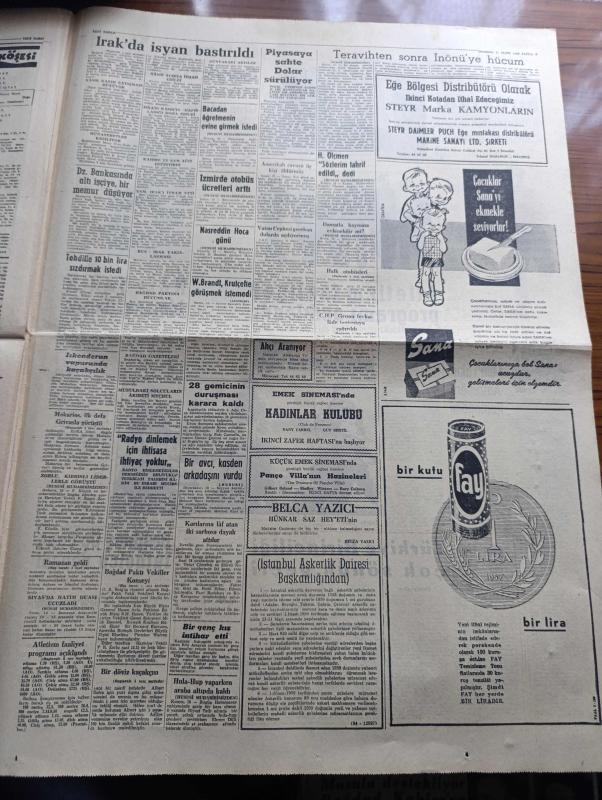 Yeni Sabah Gazetesi - Turkish Newspaper - 11 Mart 1959 - Irak'ta isyan bastırıldı - Asi Radyo Sustu - Sevvaf'la beraber birçok subay öldürülmüş - musul'da sokağa çıkmak yasak - On bir ayın sultanı Ramazan - Fransız bombası Gestapo'ya karşı - Makarios ilk defa Grivasla görüştü - fırınlar Dün özlenen Ramazan pidelerini satışa çıkardılar fotoğraf - Türk Irak hududu kapatıldı - Cafer ile Hürmüz karikatür çizen Altan Erbulak - Hayk Hammer çizen Oğuz Aral - İstanbul Ankara Radyosu Programı - Ford - kerbela'dan sonra yazan Nezihe Araz Yazı Dizisi - milli kaleci Turgay Şeren futbolu bırakıyor - Vefa ile liderlik müsabakasına çıkacak Galatasaraylılar hazırlıklarını tamamladı fotoğraf - Fenerbahçe kaptanı Naci Erdem Yarın idmana çıkıyor - atletizm faaliyet programı açıklandı - milli takım antrenörü Remondini - Adalet Kulübü anlaşamadığı futbolcularını satışa çıkaracak - Türkiye birinciliği çok sönük geçti yazan Yalçın Granit - O'Brien gülleyi 19.02 savurdu - Vefalı futbolcular fotoğraf adlı eser, Kitap > Süreli Yayınlar > Gazeteler > Türkiye > Genel > Günlük kategorisinde İkinci El olarak satıştadır.
