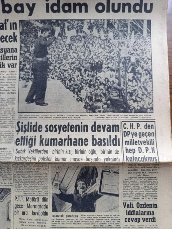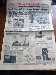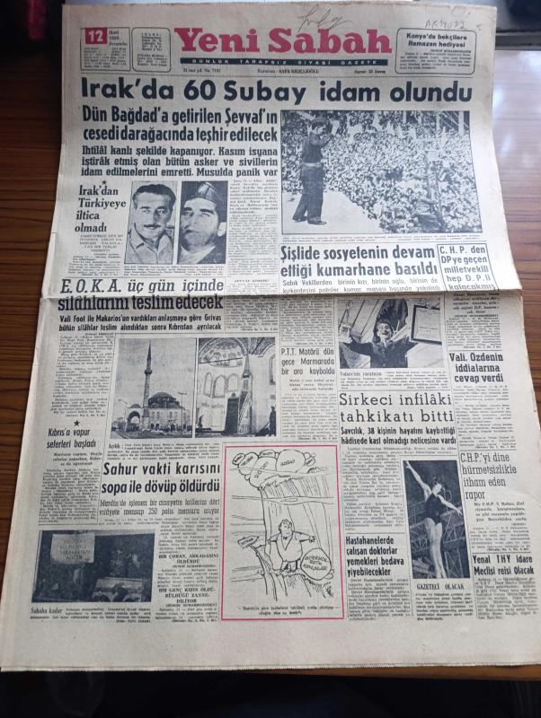 Yeni Sabah Gazetesi - Turkish Newspaper - 12 Mart 1959 - Irak'ta 60 subay idam olundu - Irak başvekili Abdülkerim Kasım karışıklıkların ilk günü Bağdat'ta Raşit caddesi'ni dolduran halka hitap ederken fotoğraf - Şişli Nihat bey apartmanında sosyetenin devam ettiği kumarhane basıldı - Yılın en çok satılan volare plağı fotoğraf - E.O.K.A üç gün içinde silahlarını teslim edecek - Kıbrıs'a vapur seferleri başladı - Vali Ethem Yetkiner Ekrem Özden'in iddialarına cevap verdi - CHP'yi dine hürmetsizlikle itham eden rapor - Ulvi Yenal Türk Hava Yolları idare Meclisi reisi olacak - Cafer ile Hürmüz karikatür çizen Altan Erbulak - Hayk Hammer çizen Oğuz Aral - sinema tiyatro programı - kerbela'dan sonra yazan Nezihe Araz Yazı Dizisi - 1959 Modeli Rambler Hudson - Vefa Galatasaray'a yenilmeyerek Grup liderliğini muhafaza etti fotoğraflar - İstanbulspor ilk galibiyeti Beykoz'dan aldı - arjantin'den telgraf bekleyen Turgay Şeren kulübünün tutumundan şikayetçi - Remondini milli takım antrenörü oldu, Safa Kılıçlıoğlu tarafından kaleme alınmıştır. Yeni Sabah Gazetesi - Turkish Newspaper - 12 Mart 1959 - Irak'ta 60 subay idam olundu - Irak başvekili Abdülkerim Kasım karışıklıkların ilk günü Bağdat'ta Raşit caddesi'ni dolduran halka hitap ederken fotoğraf - Şişli Nihat bey apartmanında sosyetenin devam ettiği kumarhane basıldı - Yılın en çok satılan volare plağı fotoğraf - E.O.K.A üç gün içinde silahlarını teslim edecek - Kıbrıs'a vapur seferleri başladı - Vali Ethem Yetkiner Ekrem Özden'in iddialarına cevap verdi - CHP'yi dine hürmetsizlikle itham eden rapor - Ulvi Yenal Türk Hava Yolları idare Meclisi reisi olacak - Cafer ile Hürmüz karikatür çizen Altan Erbulak - Hayk Hammer çizen Oğuz Aral - sinema tiyatro programı - kerbela'dan sonra yazan Nezihe Araz Yazı Dizisi - 1959 Modeli Rambler Hudson - Vefa Galatasaray'a yenilmeyerek Grup liderliğini muhafaza etti fotoğraflar - İstanbulspor ilk galibiyeti Beykoz'dan aldı - arjantin'den telgraf bekleyen Turgay Şeren kulübünün tutumundan şikayetçi - Remondini milli takım antrenörü oldu adlı eser Türkçe dilindedir.