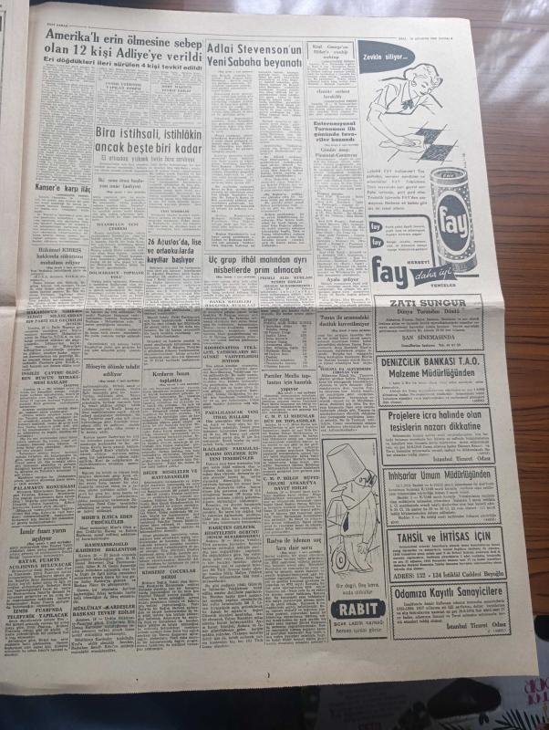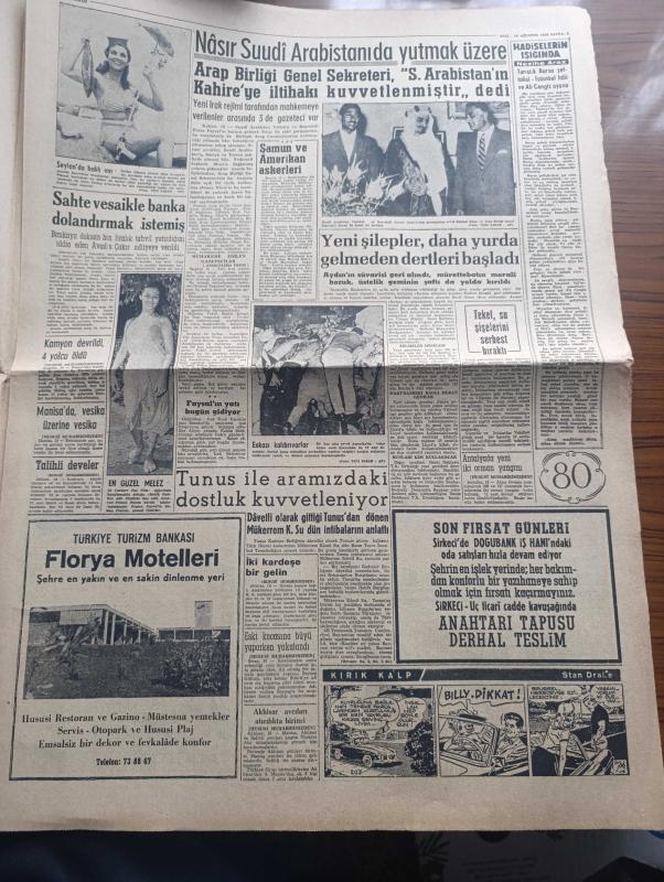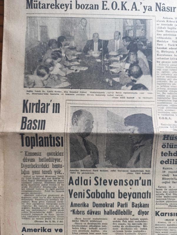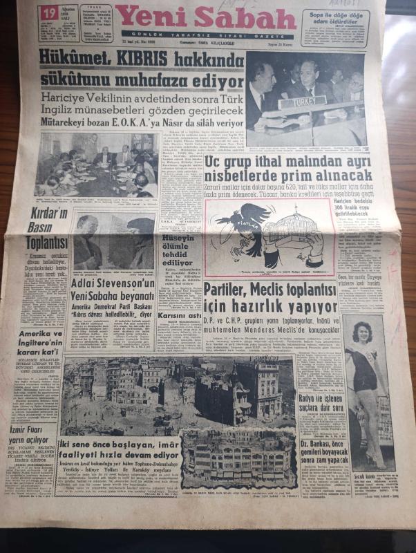 Yeni Sabah Gazetesi - Turkish Newspaper - 19 Ağustos 1958 - hükümet Kıbrıs hakkında sükutunu muhafaza ediyor - mütarekeyi bozan E.O.K.A'ya Nasır da silah veriyor - sağlık vekili Doktor Lütfi Kırdar'ın basın toplantısı fotoğraf - Üç Grup ithal malından ayrı nispetlerde prim alınacak - Amerika Demokrat Parti Başkanı Adlai Stevenson'un Yeni Sabaha beyanatı fotoğraf - imar faaliyetleri hızlandı Tophane Dolmabahçe Yeniköy İstinye ile Karaköy meydanı fotoğraf - Cafer ile Hürmüz karikatür çizen Altan Erbulak - Hayk Hammer çizen Oğuz Aral - gülhane'deki sünnet düğünü filme alınacak - çölde bir rüya yazan Va Nü yazı dizisi - burç falınız - Tıp postası yazan doçent Doktor Osman Barlas - Müslüman kardeşler başkanı Tevkif edildi - enternasyonal tenis turnuvasının ilk gününde favoriler kazandı fotoğraf - 6. Avrupa atletizm Şampiyonası - Aydın Onur 100 metre müsabakasında yegane ümidimizdir fotoğraf - yüzme federasyonu reisi Rıza Salih Saray fotoğraf - boksör Patterson Harris ile karşılaşacak, Safa Kılıçlıoğlu tarafından kaleme alınmıştır. Yeni Sabah Gazetesi - Turkish Newspaper - 19 Ağustos 1958 - hükümet Kıbrıs hakkında sükutunu muhafaza ediyor - mütarekeyi bozan E.O.K.A'ya Nasır da silah veriyor - sağlık vekili Doktor Lütfi Kırdar'ın basın toplantısı fotoğraf - Üç Grup ithal malından ayrı nispetlerde prim alınacak - Amerika Demokrat Parti Başkanı Adlai Stevenson'un Yeni Sabaha beyanatı fotoğraf - imar faaliyetleri hızlandı Tophane Dolmabahçe Yeniköy İstinye ile Karaköy meydanı fotoğraf - Cafer ile Hürmüz karikatür çizen Altan Erbulak - Hayk Hammer çizen Oğuz Aral - gülhane'deki sünnet düğünü filme alınacak - çölde bir rüya yazan Va Nü yazı dizisi - burç falınız - Tıp postası yazan doçent Doktor Osman Barlas - Müslüman kardeşler başkanı Tevkif edildi - enternasyonal tenis turnuvasının ilk gününde favoriler kazandı fotoğraf - 6. Avrupa atletizm Şampiyonası - Aydın Onur 100 metre müsabakasında yegane ümidimizdir fotoğraf - yüzme federasyonu reisi Rıza Salih Saray fotoğraf - boksör Patterson Harris ile karşılaşacak adlı eser Türkçe dilindedir.