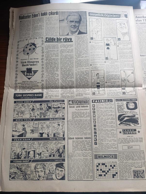 Yeni Sabah Gazetesi - Turkish Newspaper - 19 Ağustos 1958 - hükümet Kıbrıs hakkında sükutunu muhafaza ediyor - mütarekeyi bozan E.O.K.A'ya Nasır da silah veriyor - sağlık vekili Doktor Lütfi Kırdar'ın basın toplantısı fotoğraf - Üç Grup ithal malından ayrı nispetlerde prim alınacak - Amerika Demokrat Parti Başkanı Adlai Stevenson'un Yeni Sabaha beyanatı fotoğraf - imar faaliyetleri hızlandı Tophane Dolmabahçe Yeniköy İstinye ile Karaköy meydanı fotoğraf - Cafer ile Hürmüz karikatür çizen Altan Erbulak - Hayk Hammer çizen Oğuz Aral - gülhane'deki sünnet düğünü filme alınacak - çölde bir rüya yazan Va Nü yazı dizisi - burç falınız - Tıp postası yazan doçent Doktor Osman Barlas - Müslüman kardeşler başkanı Tevkif edildi - enternasyonal tenis turnuvasının ilk gününde favoriler kazandı fotoğraf - 6. Avrupa atletizm Şampiyonası - Aydın Onur 100 metre müsabakasında yegane ümidimizdir fotoğraf - yüzme federasyonu reisi Rıza Salih Saray fotoğraf - boksör Patterson Harris ile karşılaşacak adlı eser, Kitap > Süreli Yayınlar > Gazeteler > Türkiye > Genel > Günlük kategorisinde İkinci El olarak satıştadır.
