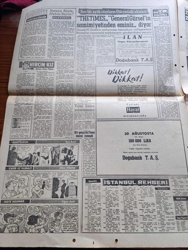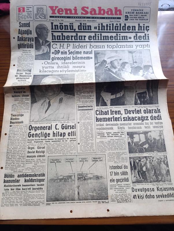 Yeni Sabah Gazetesi - Turkish Newspaper - 2 Haziran 1960 - İsmet İnönü dün ihtilalden hiç haberdar edilmedim dedi - CHP lideri İsmet İnönü basın toplantısı yaptı - Demokrat Parti'nin seçime nasıl gireceğini bilemem - Orgeneral Cemal Gürsel gençliğe hitap etti fotoğraf - Samed Ağaoğlu Ankara'ya götürüldü - Selim Sarper Celal Bayar ve Adnan Menderes ile görüştüğünü açıkladı - Gençlik Anıtkabir'i ziyaret etti Fotoğrafı - Cihat İren devlet olarak kemerleri sıkacağız dedi - Muhlis Erdener İhsan Doruk ve Raif Dinçkök bir askeri vasıta ile Davutpaşa kışlasına götürülüyor fotoğraf - İstanbul'da 17 bin silah ele geçirildi - bütün anti demokratik kanunlar kaldırılıyor - The Times General Cemal Gürsel'in samimiyetinden eminiz diyor - 27 Nisan'dan 27 Mayıs'a 555 K - Nihayet polislere beklenen emir verildi gaz bombaları kullanın - dertli dolap Yunus Emre'nin hayatı yazan Nezihe Araz Yazı Dizisi - Balkan güreş şampiyonası bugün burgaz'da başlıyor - Cihat Arman Fenerbahçe'de vazife aldı - baraj maçı adlı eser, Kitap > Süreli Yayınlar > Gazeteler > Türkiye > Genel > Günlük kategorisinde İkinci El olarak satıştadır.