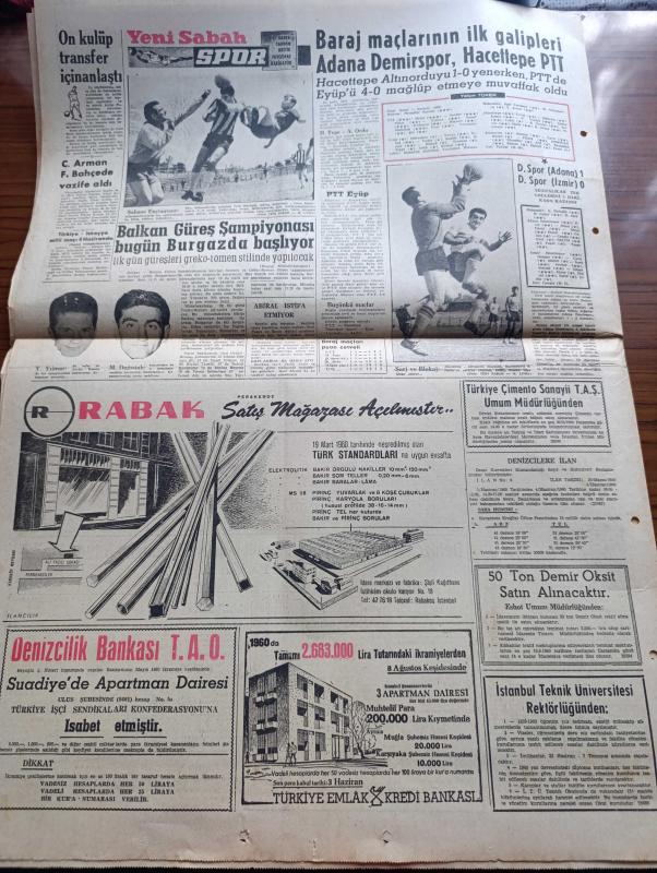Yeni Sabah Gazetesi - Turkish Newspaper - 2 Haziran 1960 - İsmet İnönü dün ihtilalden hiç haberdar edilmedim dedi - CHP lideri İsmet İnönü basın toplantısı yaptı - Demokrat Parti'nin seçime nasıl gireceğini bilemem - Orgeneral Cemal Gürsel gençliğe hitap etti fotoğraf - Samed Ağaoğlu Ankara'ya götürüldü - Selim Sarper Celal Bayar ve Adnan Menderes ile görüştüğünü açıkladı - Gençlik Anıtkabir'i ziyaret etti Fotoğrafı - Cihat İren devlet olarak kemerleri sıkacağız dedi - Muhlis Erdener İhsan Doruk ve Raif Dinçkök bir askeri vasıta ile Davutpaşa kışlasına götürülüyor fotoğraf - İstanbul'da 17 bin silah ele geçirildi - bütün anti demokratik kanunlar kaldırılıyor - The Times General Cemal Gürsel'in samimiyetinden eminiz diyor - 27 Nisan'dan 27 Mayıs'a 555 K - Nihayet polislere beklenen emir verildi gaz bombaları kullanın - dertli dolap Yunus Emre'nin hayatı yazan Nezihe Araz Yazı Dizisi - Balkan güreş şampiyonası bugün burgaz'da başlıyor - Cihat Arman Fenerbahçe'de vazife aldı - baraj maçı, Safa Kılıçlıoğlu tarafından kaleme alınmıştır. Yeni Sabah Gazetesi - Turkish Newspaper - 2 Haziran 1960 - İsmet İnönü dün ihtilalden hiç haberdar edilmedim dedi - CHP lideri İsmet İnönü basın toplantısı yaptı - Demokrat Parti'nin seçime nasıl gireceğini bilemem - Orgeneral Cemal Gürsel gençliğe hitap etti fotoğraf - Samed Ağaoğlu Ankara'ya götürüldü - Selim Sarper Celal Bayar ve Adnan Menderes ile görüştüğünü açıkladı - Gençlik Anıtkabir'i ziyaret etti Fotoğrafı - Cihat İren devlet olarak kemerleri sıkacağız dedi - Muhlis Erdener İhsan Doruk ve Raif Dinçkök bir askeri vasıta ile Davutpaşa kışlasına götürülüyor fotoğraf - İstanbul'da 17 bin silah ele geçirildi - bütün anti demokratik kanunlar kaldırılıyor - The Times General Cemal Gürsel'in samimiyetinden eminiz diyor - 27 Nisan'dan 27 Mayıs'a 555 K - Nihayet polislere beklenen emir verildi gaz bombaları kullanın - dertli dolap Yunus Emre'nin hayatı yazan Nezihe Araz Yazı Dizisi - Balkan güreş şampiyonası bugün burgaz'da başlıyor - Cihat Arman Fenerbahçe'de vazife aldı - baraj maçı adlı eser Türkçe dilindedir.