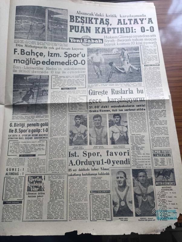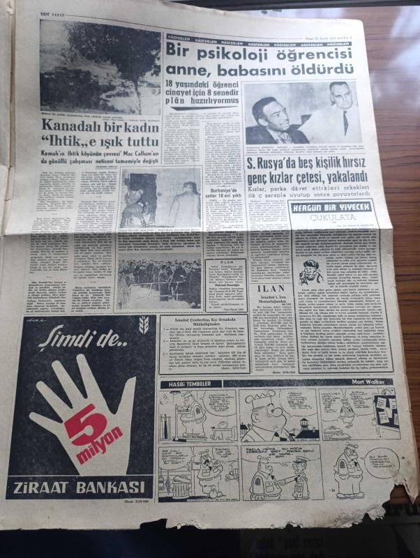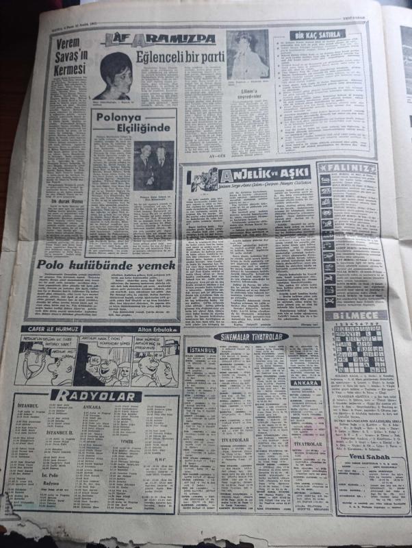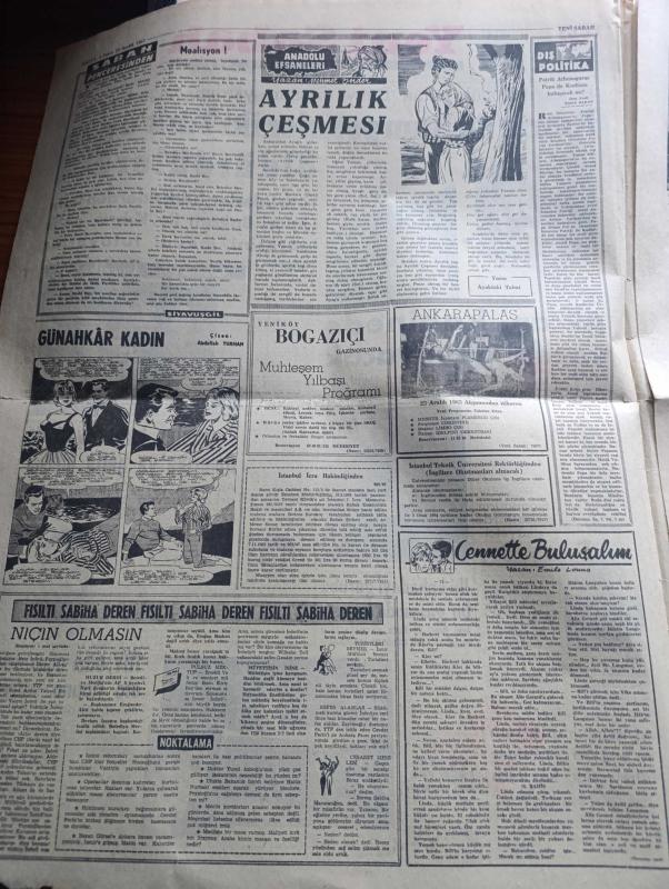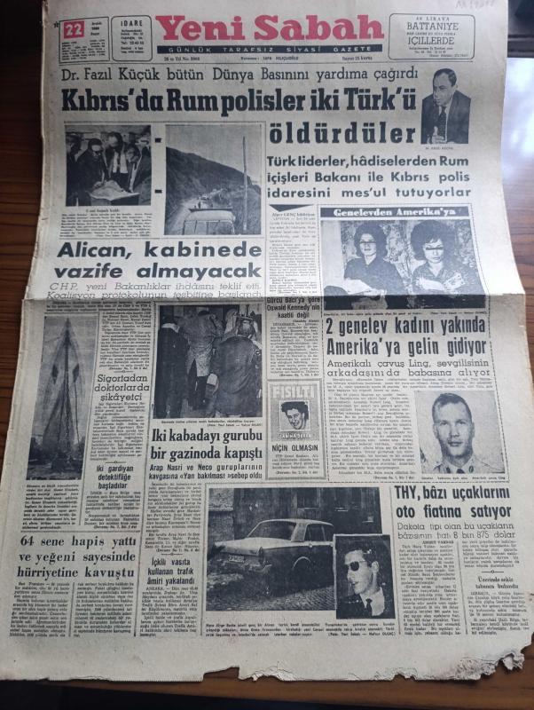 Yeni Sabah Gazetesi - Turkish Newspaper - 22 Aralık 1963 - Doktor Fazıl Küçük bütün dünya basınını yardıma çağırdı - Kıbrıs'ta rum polisler 2 Türk'ü öldürdüler - Türk liderler hadiselerden Rum İçişleri Bakanı Polycarpos Yiogradjis ile Kıbrıs polis idaresini mesul tutuyor - Aşık Olan Amerikalı Çavuş sayesinde 2 genelev kadını yakında Amerika'ya gelin gidiyor fotoğraf - 2 kabadayı grubu Arap Nasri Ve Neco bir gazinoda kapıştı - Dışişlerinden Rahmi Gümrükçüoğlunun evlilik yıldönümü münasebetiyle yaptığı Parti - Fenerbahçe İzmirsporu mağlup edemedi - Beşiktaş altay'a puan kaptırdı - güreşte Ruslarla bu gece karşılaşıyoruz - genç kızların sevgilisi Tamer Yiğit fotoğraf - Türkan Şoray ve Tamer Yiğit fotoğraf - Semra Sar ve Ahmet Mekin'in aşk sahnesi için vinç getirtildi fotoğraf - balık gözlü sanatkar Gülriz Sururi fotoğraf - Kerim Afşar kanaryası ile fazla meşgul fotoğraf - Tümay Tuncalp üç öfkeli genç filminde fotoğraf - bu yılın en başarılı ekibi Feriköy - Fenerbahçe kaptanı Şeref Has adlı eser, Kitap > Süreli Yayınlar > Gazeteler > Türkiye > Genel > Günlük kategorisinde İkinci El olarak satıştadır.