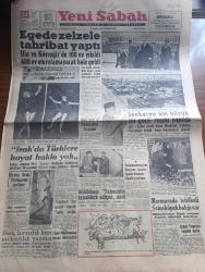 Yeni Sabah Gazetesi - Turkish Newspaper - 26 Nisan 1959 - Ege'de zelzele tahribat yaptı ula ve Köyceğiz'de 100 ev yıkıldı 600 ev oturulamayacak hale geldi - Endonezya devlet reisi Ahmet Soekarno ve Reisicumhur Celal Bayar Anıtkabir'i ziyaret ediyorlar fotoğraf - Ahmet Soekarno için büyük bir geçit resmi yapıldı fotoğraf - Marmara'da tehlikeli 5 cins köpek balığı var fotoğraf - İzmir fuarına rağbet fazla - Osman Bölükbaşı tahminim tahakkuk ediyor dedi - Amerika'da Tibet için bir gönüllü tugayı kuruldu - Irak'ta Türklere hayat hakkı yok - Irak'tan çıkarılan Mecit Türkcan Atatürk'ün resimlerinin yakıldığını 90 yaşındaki Türklerin hapse atıldığını söyledi - ateşli dişi kedi Brigitte Bardot - Doktor Fazıl Küçük Makariosla makamında görüştü - bolivya'da ihtilal - bilinmeyen hususiyetleriyle Osmanlı padişahları yazan Reşat Ekrem Koçu Yazı Dizisi - Ava Gardner ile Fred Astaire Fotoğrafı - meşhur rejisör Elia Kazan Türkiye'ye tekrar gelecek - Türkiye Romanya maçı ilk 11'leri