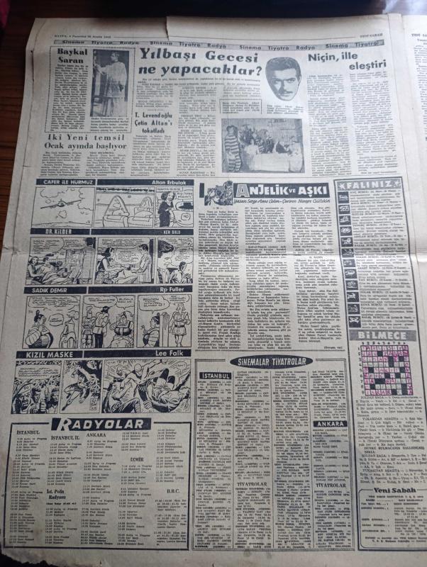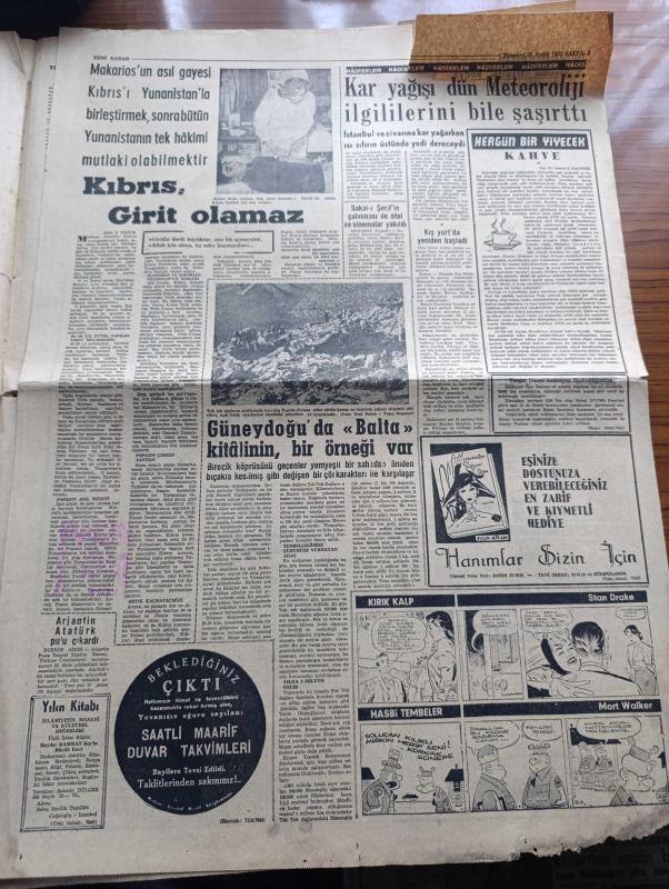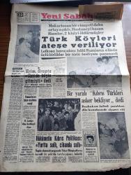 Yeni Sabah Gazetesi - Turkish Newspaper - 30 Aralık 1963 - makarios'un bir cinayeti daha ortaya çıktı hastaneyi basan Rumlar iki kişiyi öldürmüşler - masum bir Türk annesi ve yavrusu Ankara Hastanesi'nde Başbakan İsmet İnönü tarafından ziyaret ediliyor fotoğraf - Lefkoşa havaalanı hala Rumların elinde - Bir yaralı Kıbrıs Türkleri asker bekliyor dedi - hükümetin Kıbrıs politikası yurtta sulh cihanda sulh - Yunanistan bize muhtıra verdi - Nihat Erim Grupta Girit de böyle gitmişti dedi - Kıbrıslı Türk mücahitlerinin sesi bayrak Radyosu faaliyette - Arjantin Atatürk pulu çıkarttı - Fikret Hakan Genar tiyatrosunda düşman çiçek yollamaz piyesinde sahneye çıkmaktadır fotoğraf - Tarık Levendoğlu Çetin Altan'ı tokatladı - Baykal Saran - Kıbrıs'ta antrenörlük yapan eski Beşiktaşlı Recep Adanır'ın eşi ve ailesi endişe içinde fotoğraf - Göztepe Galip Gençlerbirliği ise berabere - Sunday Express İngilizlerin katili makarios'u mu koruyacağız - Kahpe Rum çetelerinin baskınına uğrayan Ayvasıklı adlı eser, Kitap > Süreli Yayınlar > Gazeteler > Türkiye > Genel > Günlük kategorisinde İkinci El olarak satıştadır.