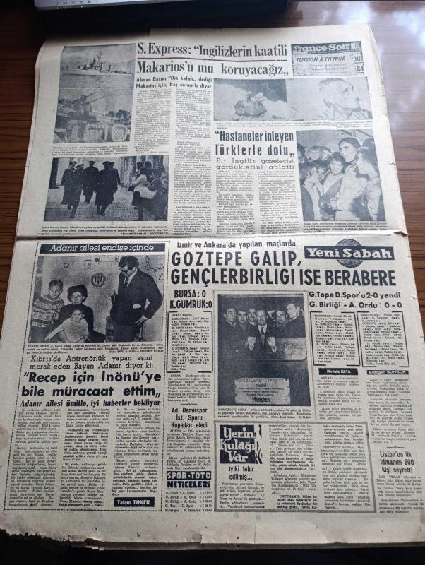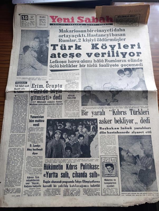 Yeni Sabah Gazetesi - Turkish Newspaper - 30 Aralık 1963 - makarios'un bir cinayeti daha ortaya çıktı hastaneyi basan Rumlar iki kişiyi öldürmüşler - masum bir Türk annesi ve yavrusu Ankara Hastanesi'nde Başbakan İsmet İnönü tarafından ziyaret ediliyor fotoğraf - Lefkoşa havaalanı hala Rumların elinde - Bir yaralı Kıbrıs Türkleri asker bekliyor dedi - hükümetin Kıbrıs politikası yurtta sulh cihanda sulh - Yunanistan bize muhtıra verdi - Nihat Erim Grupta Girit de böyle gitmişti dedi - Kıbrıslı Türk mücahitlerinin sesi bayrak Radyosu faaliyette - Arjantin Atatürk pulu çıkarttı - Fikret Hakan Genar tiyatrosunda düşman çiçek yollamaz piyesinde sahneye çıkmaktadır fotoğraf - Tarık Levendoğlu Çetin Altan'ı tokatladı - Baykal Saran - Kıbrıs'ta antrenörlük yapan eski Beşiktaşlı Recep Adanır'ın eşi ve ailesi endişe içinde fotoğraf - Göztepe Galip Gençlerbirliği ise berabere - Sunday Express İngilizlerin katili makarios'u mu koruyacağız - Kahpe Rum çetelerinin baskınına uğrayan Ayvasıklı, Safa Kılıçlıoğlu tarafından kaleme alınmıştır. Yeni Sabah Gazetesi - Turkish Newspaper - 30 Aralık 1963 - makarios'un bir cinayeti daha ortaya çıktı hastaneyi basan Rumlar iki kişiyi öldürmüşler - masum bir Türk annesi ve yavrusu Ankara Hastanesi'nde Başbakan İsmet İnönü tarafından ziyaret ediliyor fotoğraf - Lefkoşa havaalanı hala Rumların elinde - Bir yaralı Kıbrıs Türkleri asker bekliyor dedi - hükümetin Kıbrıs politikası yurtta sulh cihanda sulh - Yunanistan bize muhtıra verdi - Nihat Erim Grupta Girit de böyle gitmişti dedi - Kıbrıslı Türk mücahitlerinin sesi bayrak Radyosu faaliyette - Arjantin Atatürk pulu çıkarttı - Fikret Hakan Genar tiyatrosunda düşman çiçek yollamaz piyesinde sahneye çıkmaktadır fotoğraf - Tarık Levendoğlu Çetin Altan'ı tokatladı - Baykal Saran - Kıbrıs'ta antrenörlük yapan eski Beşiktaşlı Recep Adanır'ın eşi ve ailesi endişe içinde fotoğraf - Göztepe Galip Gençlerbirliği ise berabere - Sunday Express İngilizlerin katili makarios'u mu koruyacağız - Kahpe Rum çetelerinin baskınına uğrayan Ayvasıklı adlı eser Türkçe dilindedir.