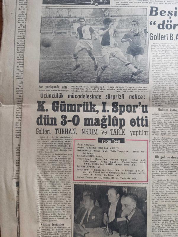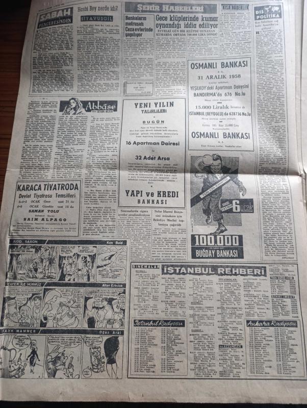 Yeni Sabah Gazetesi - Turkish Newspaper - 4 Ocak 1959 - Dr Namık Gedik 6 7 Eylül'ün dosyası kapandı dedi - Sezai Akdağ'ın Sırrı Atalay için sarf ettiği çok çirkin bir söz sert münakaşalara yol açtı - Kahraman Kaptan Kurt Carlsen İstanbul'da fotoğraf - Rus roketi güneşin peyki oluyor - Mustafi Mebus Sadettin Yalım Demokrat partiye dönmeyecek fotoğraf - belediyeye çok müsait şartlarla 100 Skoda otobüsü teklif ediliyor fotoğraf - Cafer ile Hürmüz karikatür çizen Altan Erbulak - Hayk Hammer çizen Oğuz Aral - Gina Lollobrigida Ve Bop Hope fotoğraf - Küba'da Batista 600 milyon dolar çalmakla itham ediliyor - Castillo Fidel Castro'nun emriyle Tevkif olundu - hazreti Muhammed'in torunları yazan Nezihe Araz Yazı Dizisi - Beşiktaş 4 golle dördüncü oldu Fotoğrafı - basketbol teşvik finalinde Fenerbahçe Galatasaray karşılaşıyor yazan Yalçın Granit - Karagümrük istanbulspor'u 3 0 mağlup etti - Fenerbahçe Beykoz maçı Mithatpaşa stadında - Moda Darüşşafaka'yı rahat yendi 66 60 - Galatasaray kongre adlı eser, Kitap > Süreli Yayınlar > Gazeteler > Türkiye > Genel > Günlük kategorisinde İkinci El olarak satıştadır.