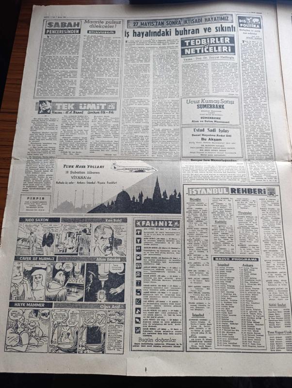 Yeni Sabah Gazetesi - Turkish Newspaper - 7 Şubat 1961 - Milli Eğitim Bakanı Turhan Feyzioğlu dün istifa etti - Adana petrolü çok ümit verici - Emniyet umum müdürü Turgut Başkaya oldu - 3. Parti kurucu heyetine 2 eski Demokrat Partili mebus giriyor - Ahmet Yıldız iyi din adamı ile dini yayına lüzum var dedi - Sümerbank dün ilk defa tenzilatlı satış yaptı - Picasso'nun bir tablosu çalındı - Cafer ile Hürmüz karikatür çizen Altan Erbulak - Hayk Hammer çizen Oğuz Aral - İstanbul'da sinema tiyatro programı - Osmanlı tarihinde erkek kızlar yazan Reşat Ekrem Koçu Yazı Dizisi - karaborsa bilet satış önlendi - İstanbul kulüpleri belediye Rusumunu protesto ediyor - Milli Ligin 23. Haftasında Fenerbahçe Ankara'ya gidiyor - basketbolda Galatasaray'ın şampiyonluğu Fotoğraf - Galatasaraylı Metin Oktay üçüncü defa askere çağırılıyor - basketbolda Afif Kayalı sezonun en centilmen hakemi seçildi fotoğraf - Spor Toto rehberi - Galatasaray Beykoz voleybol maçları - gizli işsizliğin verdiği zarar i, Safa Kılıçlıoğlu tarafından kaleme alınmıştır. Yeni Sabah Gazetesi - Turkish Newspaper - 7 Şubat 1961 - Milli Eğitim Bakanı Turhan Feyzioğlu dün istifa etti - Adana petrolü çok ümit verici - Emniyet umum müdürü Turgut Başkaya oldu - 3. Parti kurucu heyetine 2 eski Demokrat Partili mebus giriyor - Ahmet Yıldız iyi din adamı ile dini yayına lüzum var dedi - Sümerbank dün ilk defa tenzilatlı satış yaptı - Picasso'nun bir tablosu çalındı - Cafer ile Hürmüz karikatür çizen Altan Erbulak - Hayk Hammer çizen Oğuz Aral - İstanbul'da sinema tiyatro programı - Osmanlı tarihinde erkek kızlar yazan Reşat Ekrem Koçu Yazı Dizisi - karaborsa bilet satış önlendi - İstanbul kulüpleri belediye Rusumunu protesto ediyor - Milli Ligin 23. Haftasında Fenerbahçe Ankara'ya gidiyor - basketbolda Galatasaray'ın şampiyonluğu Fotoğraf - Galatasaraylı Metin Oktay üçüncü defa askere çağırılıyor - basketbolda Afif Kayalı sezonun en centilmen hakemi seçildi fotoğraf - Spor Toto rehberi - Galatasaray Beykoz voleybol maçları - gizli işsizliğin verdiği zarar i adlı eser Türkçe dilindedir.