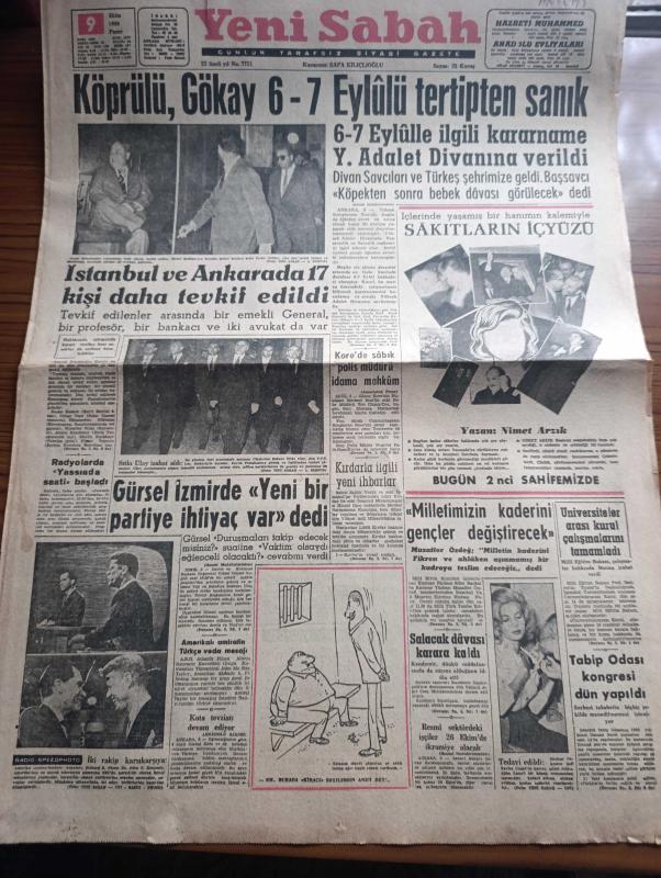Yeni Sabah Gazetesi - Turkish Newspaper - 9 Ekim 1960 - Fuat Köprülü Fahrettin Kerim Gökay 6-7 Eylül'ü tertipten sanık - 6-7 Eylül ile ilgili kararname Yüksek Adalet divanına verildi - Divan savcıları ve Alparslan Türkeş İstanbul'a geldi - Başsavcı köpekten sonra bebek davası görülecek dedi - İstanbul ve Ankara'da 17 kişi daha Tevkif edildi - Sıtkı Ulay bir izahat aldı fotoğraf - Amerika'da iki rakip Nixon ve Kennedy karşı karşıya fotoğraf - Cemal Gürsel İzmir'de yeni bir partiye ihtiyaç var dedi - Salacak Davası karara kaldı - Lütfi Kırdarla ilgili yeni ihbarlar - İstanbul Sinema Tiyatro programı - Sakıtların İçyüzü Yazan Nimet Arzık Yazı Dizisi - Cafer ile Hürmüz karikatür çizen Altan Erbulak - Hayk Hammer çizen Oğuz Aral - işçiler adına sendika idare heyeti 36 saatlik açlık grevine başladı - çılgın dünya piyesi Kani Kıpçak Sibel Göksel Ve Feridun Karakaya fotoğraf - Şirin Devrim Abdurrahman Palay ve Mehmet Karaca Shakespeare'in hırçın kızı'nda Fotoğrafı - Beşiktaş Galip geldi, Safa Kılıçlıoğlu tarafından kaleme alınmıştır. Yeni Sabah Gazetesi - Turkish Newspaper - 9 Ekim 1960 - Fuat Köprülü Fahrettin Kerim Gökay 6-7 Eylül'ü tertipten sanık - 6-7 Eylül ile ilgili kararname Yüksek Adalet divanına verildi - Divan savcıları ve Alparslan Türkeş İstanbul'a geldi - Başsavcı köpekten sonra bebek davası görülecek dedi - İstanbul ve Ankara'da 17 kişi daha Tevkif edildi - Sıtkı Ulay bir izahat aldı fotoğraf - Amerika'da iki rakip Nixon ve Kennedy karşı karşıya fotoğraf - Cemal Gürsel İzmir'de yeni bir partiye ihtiyaç var dedi - Salacak Davası karara kaldı - Lütfi Kırdarla ilgili yeni ihbarlar - İstanbul Sinema Tiyatro programı - Sakıtların İçyüzü Yazan Nimet Arzık Yazı Dizisi - Cafer ile Hürmüz karikatür çizen Altan Erbulak - Hayk Hammer çizen Oğuz Aral - işçiler adına sendika idare heyeti 36 saatlik açlık grevine başladı - çılgın dünya piyesi Kani Kıpçak Sibel Göksel Ve Feridun Karakaya fotoğraf - Şirin Devrim Abdurrahman Palay ve Mehmet Karaca Shakespeare'in hırçın kızı'nda Fotoğrafı - Beşiktaş Galip geldi adlı eser Türkçe dilindedir.