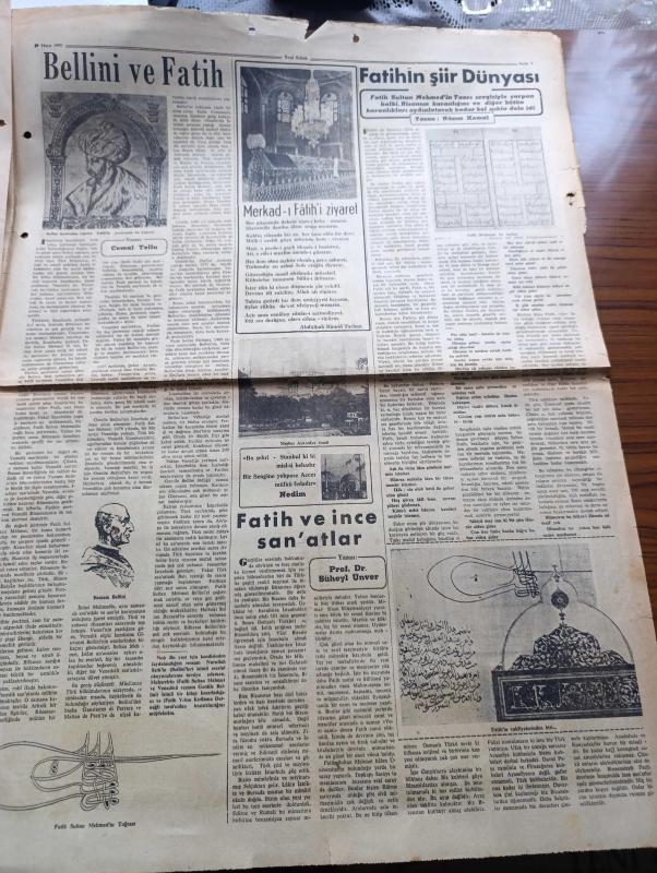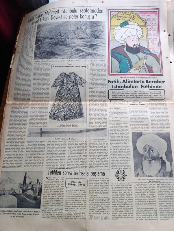 Yeni Sabah İstanbul Fethi 500. Yıl Gazetesi - Turkish Newspaper - 29 Mayıs 1953 - tam sayfa renkli Fatih Sultan Mehmet çizimi - İstanbul nasıl fethedildi yazan Kadircan Kaflı - Fatih Sultan Mehmet'in kılıcı fotoğraf - Fatih'in meşhur toplarından biri fotoğraf - 500. Yılda yazan İstanbul Valisi Fahrettin Kerim Gökay - Fatih'in babası 2. Sultan Murat yazan profesör Süheyl Ünver - Fatih devrinin en büyük alimi Akşemsettin - bir tepeden şiiri yazan Yahya Kemal Beyatlı - Fatih'in kurduğu Enderun-u Hümayun mektebi yazan İsmail Hakkı Baykal - Fatih ve adalet yazan Profesör Doktor Süheyl Ünver - Fatih devrinde Türk mimarisi yazan Yüksek mühendis Ekrem Hakkı Ayverdi - Fatih devri mimarisi Topkapı sarayı'ndaki kütüphane fotoğraf - Bellini ve Fatih yazan Cemal Tollu - Sultan Fatih'in Kaftanı fotoğraf - Fatih'in şiir dünyası Yazan Nazım Kemal - İstanbul fethinde yeniçerik ortalarına gazel yazan Yahya Kemal Beyatlı - Fatih Sultan Mehmet'in üstü ayetli kılıcı fotoğraf - Merkad-ı Fatih'i ziyaret adlı eser, Kitap > Süreli Yayınlar > Gazeteler > Türkiye > Genel > Günlük kategorisinde İkinci El olarak satıştadır.