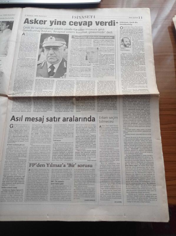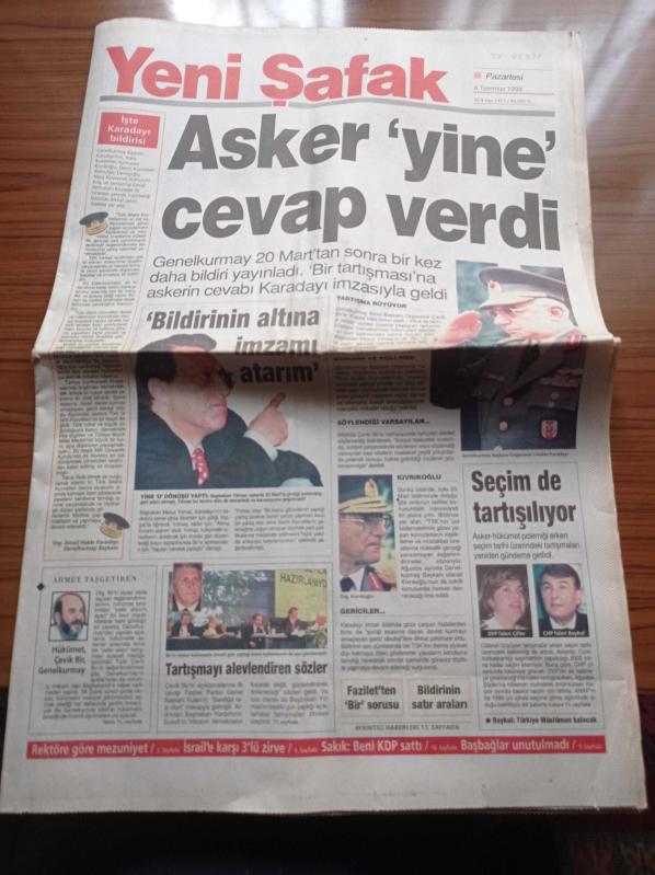 Yeni Şafak Gazetesi - 6 Temmuz 1998 - Ahmet Taşgetiren - Ömer Çelik - Aydın Menderes - Zahid Akman - Genelkurmay Başkanı Orgeneral İsmail Hakkı Karadayı - Genelkurmay 20 Mart'tan Sonra Bir Kez Daha Bildiri Yayınladı- Başbakan Mesut Yılmaz Bildirinin Altına İmza Atarım - Çevik Bir - Tansu Çiller - Deniz Baykal - Fazilet Partisi adlı eser Türkçe dilindedir.