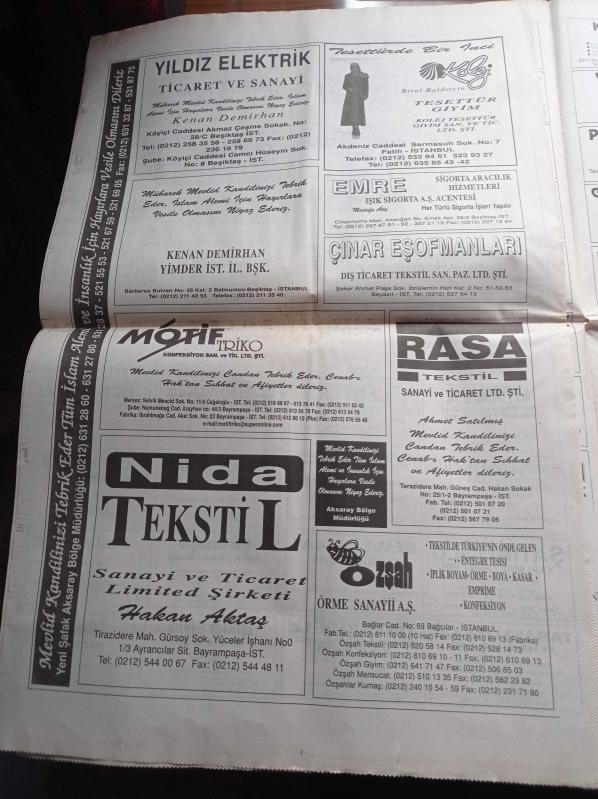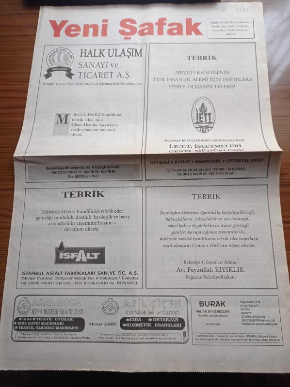 Yeni Şafak Gazetesi Mevlid Kandili Tebrik Eki - 1998 - Halk Ulaşım - İETT - İSFALT - Mavi Ofset - Kimelsan - Emin Kitapevi - Yıldız Elektrik - Nida Tekstil - Zeyrek Giyim - Hotel Demircan - Tekbir Gümüş - Akabe Makina Sanayi - Hasanoğlu Süpermarket - Sena Sultan Kliniği - Arsal Turistik Eşya İmalathanesi - Bağcılar Belediye Başkanı Avukat Feyzullah Kıyıklık adlı eser Türkçe dilindedir.