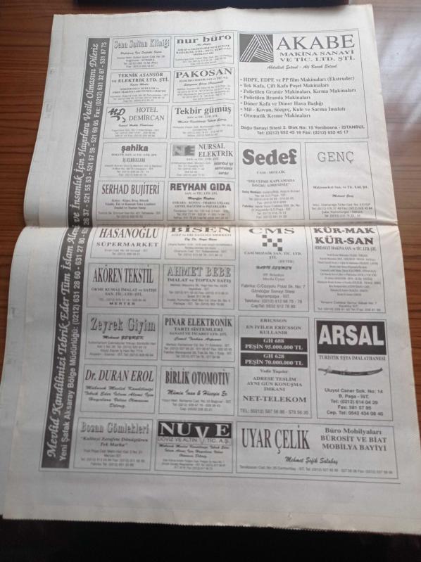 Yeni Şafak Gazetesi Mevlid Kandili Tebrik Eki - 1998 - Halk Ulaşım - İETT - İSFALT - Mavi Ofset - Kimelsan - Emin Kitapevi - Yıldız Elektrik - Nida Tekstil - Zeyrek Giyim - Hotel Demircan - Tekbir Gümüş - Akabe Makina Sanayi - Hasanoğlu Süpermarket - Sena Sultan Kliniği - Arsal Turistik Eşya İmalathanesi - Bağcılar Belediye Başkanı Avukat Feyzullah Kıyıklık adlı eser, Kitap > Süreli Yayınlar > Gazeteler kategorisinde İkinci El olarak satıştadır.