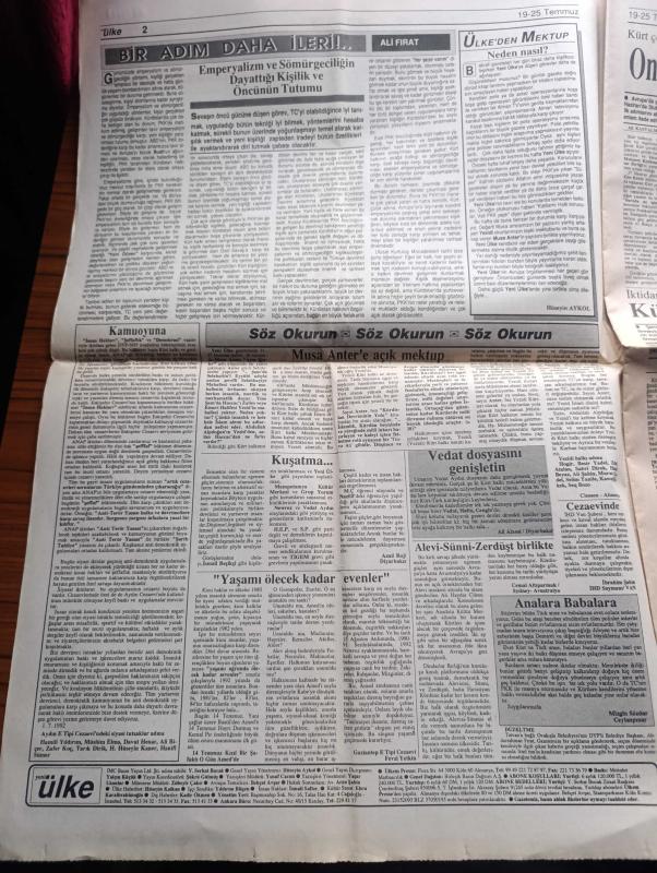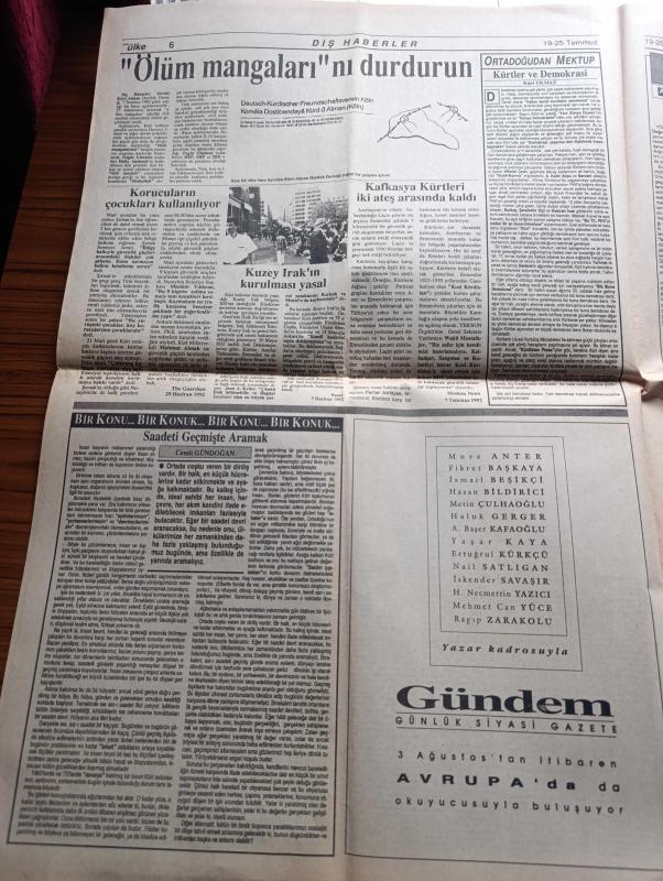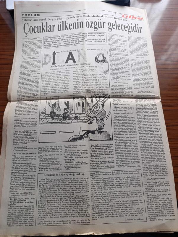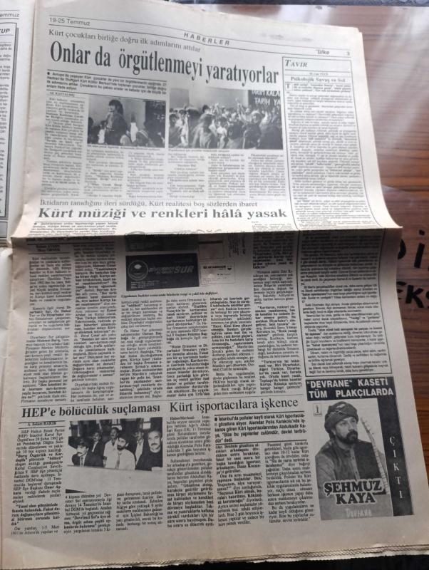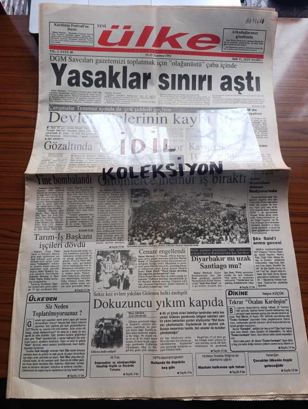Yeni Ülke Gazetesi - Turkish Newspaper - 19 25 Temmuz 1992 - DGM savcıları gazetemizi toplatmak için olağanüstü çaba içinde - Çatışmalar şiddetlendi devlet güçlerini kaybı 36 - göz altında kayıplar çoğalıyor - tekrar Öcalan kardeşim yazan Yalçın Küçük - Şex Said'i anma gecesi - Kürt kadınları Alman radyosunda - HEP'e bölücülük suçlaması - Şehmuz Kaya'nın Devrane kaseti tüm plakçılarda - Kürt müziği ve renkleri hala yasak - 10 Temmuz günü Diyarbakır asker karıncaların işgaline uğramıştı - televizyon ve Taşdelen yazan Selim Çürükkaya - Yezidiler yazan Musa Anter - korucuların çocukları kullanılıyor - Kürdistan dindarlar birliği'nin din adamlarına çağrısı - Kazakistan'da dünyaya gelen İgor şimdi de Kürtçe şarkı söylüyor Fotoğrafı - Dilan adlı çocuk dergisi çıkardığı nedeniyle cezalandırılmak istenen Kenan Şen - Vedat Aydın taziye ilanı - uluslararası Kürdistan festivali - Ayşe Zarakolu - 12 Eylül sürecini yaşamış emeğin bayrağı çalışanlarından Güzel Aslaner - cezaevlerinde açlık grevi, Serhat Bucak tarafından kaleme alınmıştır. Yeni Ülke Gazetesi - Turkish Newspaper - 19 25 Temmuz 1992 - DGM savcıları gazetemizi toplatmak için olağanüstü çaba içinde - Çatışmalar şiddetlendi devlet güçlerini kaybı 36 - göz altında kayıplar çoğalıyor - tekrar Öcalan kardeşim yazan Yalçın Küçük - Şex Said'i anma gecesi - Kürt kadınları Alman radyosunda - HEP'e bölücülük suçlaması - Şehmuz Kaya'nın Devrane kaseti tüm plakçılarda - Kürt müziği ve renkleri hala yasak - 10 Temmuz günü Diyarbakır asker karıncaların işgaline uğramıştı - televizyon ve Taşdelen yazan Selim Çürükkaya - Yezidiler yazan Musa Anter - korucuların çocukları kullanılıyor - Kürdistan dindarlar birliği'nin din adamlarına çağrısı - Kazakistan'da dünyaya gelen İgor şimdi de Kürtçe şarkı söylüyor Fotoğrafı - Dilan adlı çocuk dergisi çıkardığı nedeniyle cezalandırılmak istenen Kenan Şen - Vedat Aydın taziye ilanı - uluslararası Kürdistan festivali - Ayşe Zarakolu - 12 Eylül sürecini yaşamış emeğin bayrağı çalışanlarından Güzel Aslaner - cezaevlerinde açlık grevi adlı eser Türkçe dilindedir.