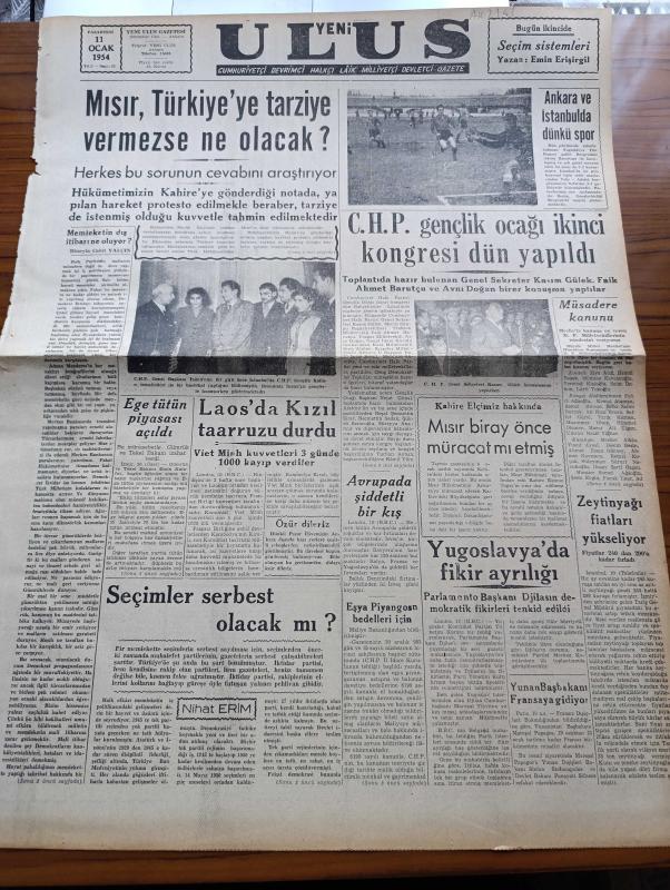 Yeni Ulus Gazetesi - 11 Ocak 1954 - Hüseyin Cahit Yalçın Köşe Yazısı - Büyükelçimizi Sınır Dışı Eden Mısır Türkiye'den Özür Dilemezse Ne Olacak - Ege Tütün Piyasası Açıldı - Laos'ta Kızıl Taarruzu Durdu - Cumhuriyet Halk Partisi Gençlik Ocağı İkinci Kongresi Dün Yapıldı - Seçimler Serbest Olacak Mı Yazan Nihat Erim - Avrupa'da Şiddetli Bir Kış - Yugoslavya'da Fikir Ayrılığı - Zeytinyağı Fiyatları Yükseliyor - Yunan Başbakanı Mareşal Papagos Fransa'ya Gidiyor - Kore'de Esirlerin Serbest Bırakılmasında Anlaşmazlık - Kayıplar Adası Çeviren Nuri Özkan Yazı Dizisi - Müthiş Cinayet Katil Nasıl Yakalandı Yazı Dizisi - Marlene Dietrich Paramount İle Yeni Mukavele İmzaladı - Ava Gardner Kocası İle Barıştı Mı - Zengin Avcısı Kadın Kathleen Davies'in Maceraları - Yugoslav Beogradski Takımı Dün Hacettepe Takımını Da 3 2 Yendi - İstanbul'da Vefa Adalet'e 3 1 Galip - Mülkiye Kupası Futbol Turnuvası - Türkiye Milli Talebe Federasyonu Tarafından Tertip Edilen Güreşler -Galatasaray Basketbol Şampiyonu, Nihat Erim tarafından kaleme alınmıştır. Yeni Ulus Gazetesi - 11 Ocak 1954 - Hüseyin Cahit Yalçın Köşe Yazısı - Büyükelçimizi Sınır Dışı Eden Mısır Türkiye'den Özür Dilemezse Ne Olacak - Ege Tütün Piyasası Açıldı - Laos'ta Kızıl Taarruzu Durdu - Cumhuriyet Halk Partisi Gençlik Ocağı İkinci Kongresi Dün Yapıldı - Seçimler Serbest Olacak Mı Yazan Nihat Erim - Avrupa'da Şiddetli Bir Kış - Yugoslavya'da Fikir Ayrılığı - Zeytinyağı Fiyatları Yükseliyor - Yunan Başbakanı Mareşal Papagos Fransa'ya Gidiyor - Kore'de Esirlerin Serbest Bırakılmasında Anlaşmazlık - Kayıplar Adası Çeviren Nuri Özkan Yazı Dizisi - Müthiş Cinayet Katil Nasıl Yakalandı Yazı Dizisi - Marlene Dietrich Paramount İle Yeni Mukavele İmzaladı - Ava Gardner Kocası İle Barıştı Mı - Zengin Avcısı Kadın Kathleen Davies'in Maceraları - Yugoslav Beogradski Takımı Dün Hacettepe Takımını Da 3 2 Yendi - İstanbul'da Vefa Adalet'e 3 1 Galip - Mülkiye Kupası Futbol Turnuvası - Türkiye Milli Talebe Federasyonu Tarafından Tertip Edilen Güreşler -Galatasaray Basketbol Şampiyonu adlı eser Türkçe dilindedir.