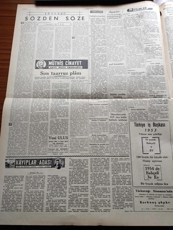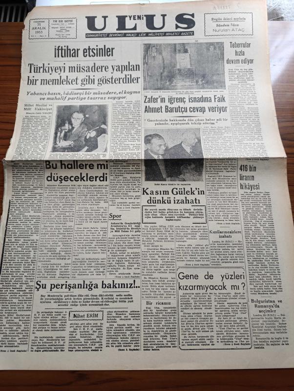 Yeni Ulus Gazetesi - 21 Aralık 1953 - Yabancı Basında CHP'nin Mallarının Alınması Hadisesi - İsmet İnönü Kasım Gülek'le Toplantıda - Zafer Gazetesinin İğrenç İsnadına Faik Ahmet Barutçu Cevap Veriyor - Ankara'da Gençlerbirliği Avusturya'ya 8 2 Mağlup Oldu - Hüseyin Cahit Yalçın - Kore'de Kızılların Esirlere İzahatı - Nihat Erim - Nurullah Ataç Köşe Yazısı - Müthiş Cinayet Katil Nasıl Yakalandı - İki Açıkgöz Katillere Karşı Filmi - Pamuk Prenses Ve Yedi Cüceler Filmi - Kayıplar Adası Çeviren Nuri Özkan Yazı - Pakistan'a Amerikan Yardımı - Güzellik Müsabakalarının İçyüzü Yazı Dizisi - Nivea Krem - Yeni Çıkan Sahibinin Sesi Plakları - Minerva Dikiş Makinesi - Hamiyet Yüceses - Abdullah Yüce - Mustafa Çağlar - Orion Radyoları - Ozon Çamaşır Suyu- Vikodin Tablet, Nihat Erim tarafından kaleme alınmıştır. Yeni Ulus Gazetesi - 21 Aralık 1953 - Yabancı Basında CHP'nin Mallarının Alınması Hadisesi - İsmet İnönü Kasım Gülek'le Toplantıda - Zafer Gazetesinin İğrenç İsnadına Faik Ahmet Barutçu Cevap Veriyor - Ankara'da Gençlerbirliği Avusturya'ya 8 2 Mağlup Oldu - Hüseyin Cahit Yalçın - Kore'de Kızılların Esirlere İzahatı - Nihat Erim - Nurullah Ataç Köşe Yazısı - Müthiş Cinayet Katil Nasıl Yakalandı - İki Açıkgöz Katillere Karşı Filmi - Pamuk Prenses Ve Yedi Cüceler Filmi - Kayıplar Adası Çeviren Nuri Özkan Yazı - Pakistan'a Amerikan Yardımı - Güzellik Müsabakalarının İçyüzü Yazı Dizisi - Nivea Krem - Yeni Çıkan Sahibinin Sesi Plakları - Minerva Dikiş Makinesi - Hamiyet Yüceses - Abdullah Yüce - Mustafa Çağlar - Orion Radyoları - Ozon Çamaşır Suyu- Vikodin Tablet adlı eser Türkçe dilindedir.