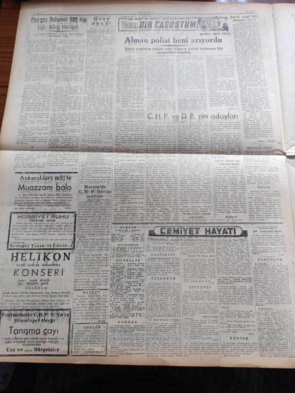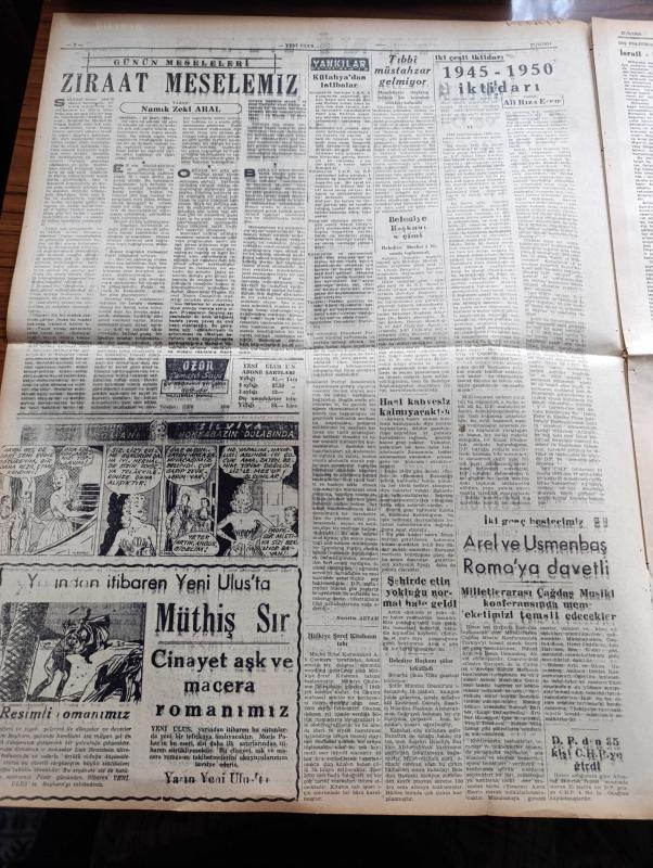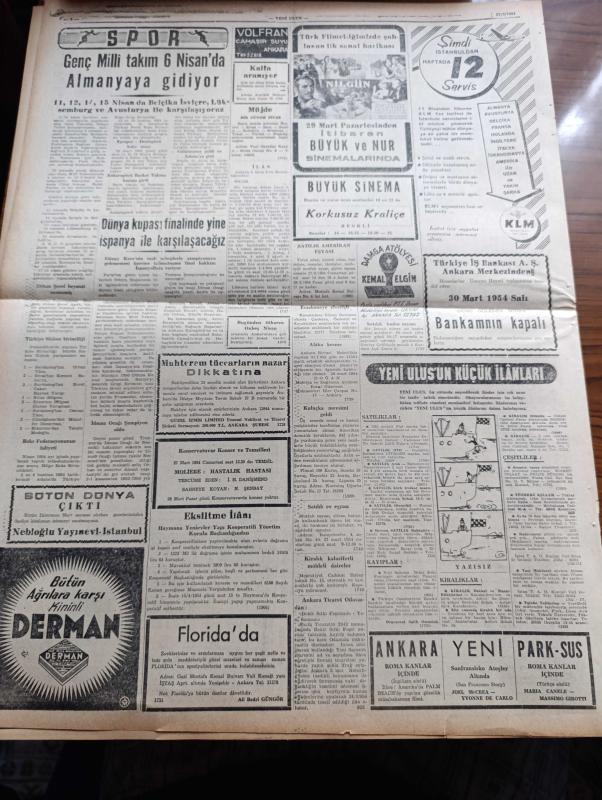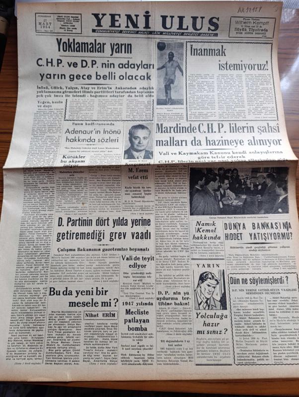 Yeni Ulus Gazetesi - Turkish Newspaper - 27 Mart 1954 - Yeğen kuzin ve dayı yazan Hüseyin Cahit Yalçın Başmakale - Cumhuriyet Halk Partisi ve Demokrat Parti'nin adayları Yarın gece belli olacak - brezilyalı futbol yıldızlarından Santos fotoğraf - Mardin'de CHP'lilerin şahsi malları da hazineye alınıyor - Paris konferansında Adenauer'in İsmet İnönü hakkındaki sözleri - Demokrat Parti'nin 4 yılda yerine getiremediği grev vardı - Korgeneral Mustafa Erem vefat etti fotoğraf - Namık Kemal hakkında - Bu da yeni bir mesele mi yazan Nihat Erim - dünya bankası'nda hiddet yatışıyor mu - İki genç bestecimiz Bülent Arel ve İlhan Usmanbaş roma'ya davetli - Georges Buhamel 500 den fazla kitap imzaladı - Wilma Montesi hadisesi nasıl patlak verdi - Yılın en meraklısı zabıta romanı Kuğulu köşkün esrarı - Nilgün filmi başrolde Cüneyt gökçer ve Erika Remberg büyük ve nur sinemalarında - genç milli takım 6 Nisan'da Almanya'ya gidiyor - Dünya Kupası finalinde İspanya ile karşılaşacağız - damga atölyesi adlı eser, Kitap > Süreli Yayınlar > Gazeteler > Türkiye > Genel > Günlük kategorisinde İkinci El olarak satıştadır.