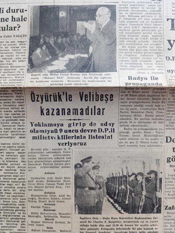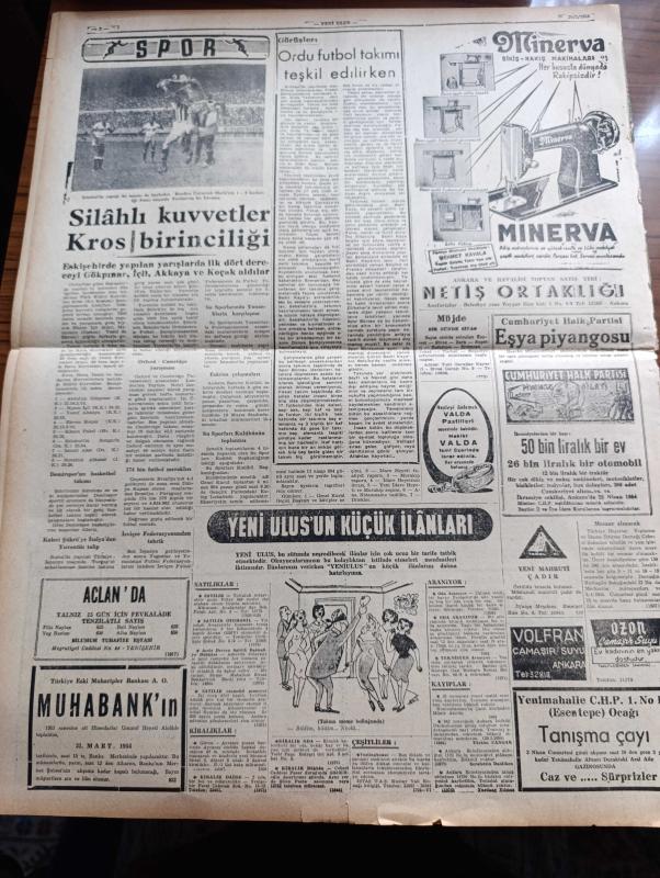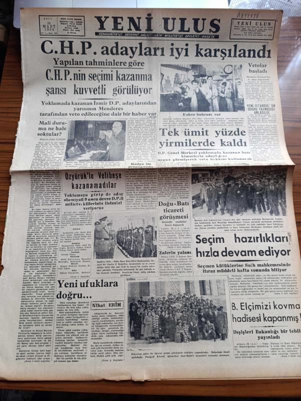Yeni Ulus Gazetesi - Turkish Newspaper - 30 Mart 1954 - mali durumu ne hale soktular yazan Hüseyin Cahit Yalçın Başmakale - CHP adayları iyi karşılandı - yapılan tahminlere göre CHP'nin seçimi kazanma şansı kuvvetli görülüyor - kahve buhranı var fotoğraf - Mithat Cemal Kuntay Türk ocağı salonunda Mehmet Akif hakkında büyük ilgi toplayan bir konferans verdi fotoğraf - Yeni İstanbul gazetesinin doğru yazmadığı anlaşıldı - Radyo ile propaganda - merhum Arif Çubukçu'nun cenazesi Hacıbayram camii'nden kaldırıldı fotoğraf - seçim hazırlıkları hızla devam ediyor - Mısır'da büyükelçimizi kovma hadisesi kapanmış - Yeni ufuklara doğru yazan Nihat Erim - Doktor antipatisi yazan Rasim Adasal - Atatürk için telif eser yarışması - israilliler bir Ürdün köyüne hücum etti - portreler Mac Carthy de kimdir - hidrojen bombası meselesi - silahlı kuvvetler Kros birinciliği - Eskişehir'de yapılan yarışlarda ilk 4 dereceyi Abdullah Gökpınar Nazım İçli Yusuf Akkaya ve Ekrem Koçak aldılar - Ordu futbol takımı, Nihat Erim tarafından kaleme alınmıştır. Yeni Ulus Gazetesi - Turkish Newspaper - 30 Mart 1954 - mali durumu ne hale soktular yazan Hüseyin Cahit Yalçın Başmakale - CHP adayları iyi karşılandı - yapılan tahminlere göre CHP'nin seçimi kazanma şansı kuvvetli görülüyor - kahve buhranı var fotoğraf - Mithat Cemal Kuntay Türk ocağı salonunda Mehmet Akif hakkında büyük ilgi toplayan bir konferans verdi fotoğraf - Yeni İstanbul gazetesinin doğru yazmadığı anlaşıldı - Radyo ile propaganda - merhum Arif Çubukçu'nun cenazesi Hacıbayram camii'nden kaldırıldı fotoğraf - seçim hazırlıkları hızla devam ediyor - Mısır'da büyükelçimizi kovma hadisesi kapanmış - Yeni ufuklara doğru yazan Nihat Erim - Doktor antipatisi yazan Rasim Adasal - Atatürk için telif eser yarışması - israilliler bir Ürdün köyüne hücum etti - portreler Mac Carthy de kimdir - hidrojen bombası meselesi - silahlı kuvvetler Kros birinciliği - Eskişehir'de yapılan yarışlarda ilk 4 dereceyi Abdullah Gökpınar Nazım İçli Yusuf Akkaya ve Ekrem Koçak aldılar - Ordu futbol takımı adlı eser Türkçe dilindedir.