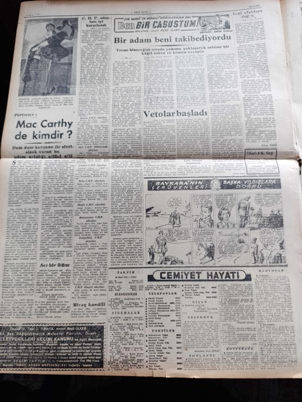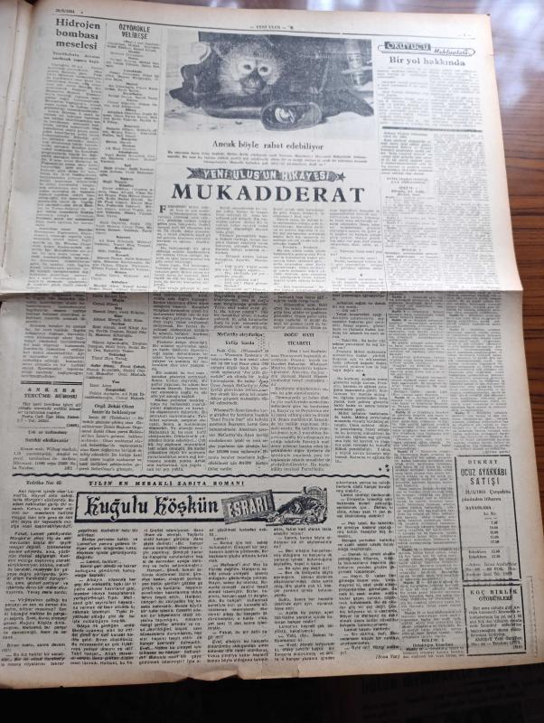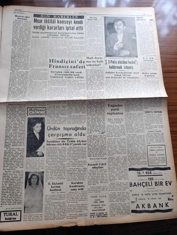 Yeni Ulus Gazetesi - Turkish Newspaper - 30 Mart 1954 - mali durumu ne hale soktular yazan Hüseyin Cahit Yalçın Başmakale - CHP adayları iyi karşılandı - yapılan tahminlere göre CHP'nin seçimi kazanma şansı kuvvetli görülüyor - kahve buhranı var fotoğraf - Mithat Cemal Kuntay Türk ocağı salonunda Mehmet Akif hakkında büyük ilgi toplayan bir konferans verdi fotoğraf - Yeni İstanbul gazetesinin doğru yazmadığı anlaşıldı - Radyo ile propaganda - merhum Arif Çubukçu'nun cenazesi Hacıbayram camii'nden kaldırıldı fotoğraf - seçim hazırlıkları hızla devam ediyor - Mısır'da büyükelçimizi kovma hadisesi kapanmış - Yeni ufuklara doğru yazan Nihat Erim - Doktor antipatisi yazan Rasim Adasal - Atatürk için telif eser yarışması - israilliler bir Ürdün köyüne hücum etti - portreler Mac Carthy de kimdir - hidrojen bombası meselesi - silahlı kuvvetler Kros birinciliği - Eskişehir'de yapılan yarışlarda ilk 4 dereceyi Abdullah Gökpınar Nazım İçli Yusuf Akkaya ve Ekrem Koçak aldılar - Ordu futbol takımı adlı eser, Kitap > Süreli Yayınlar > Gazeteler > Türkiye > Genel > Günlük kategorisinde İkinci El olarak satıştadır.