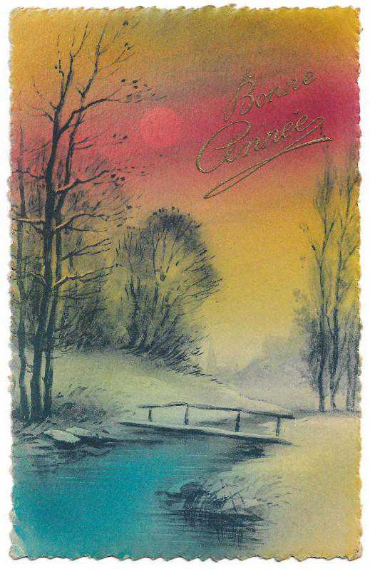 Yeni yıl kartpostalları, Fransızca mutlu yıllar (Bonne Annee) yazılı, arka yüzünde tebrik mesajı var.