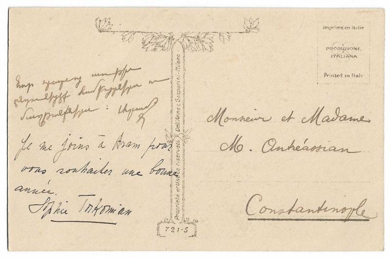 Yeni yıl kartpostalları, Fransızca mutlu yıllar (Bonne Annee) yazılı, arka yüzünde tebrik mesajı var, Constantinople adresli.