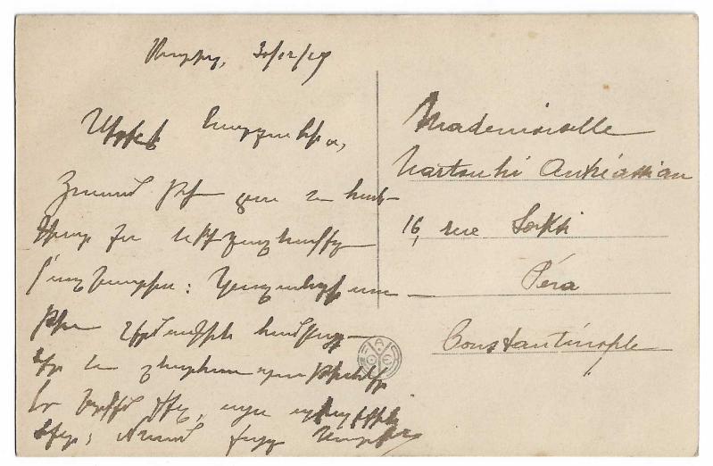 Yeni yıl kartpostalları, Fransızca mutlu yıllar (Bonne Annee) yazılı, arka yüzünde tebrik mesajı var, Constantinople adresli.