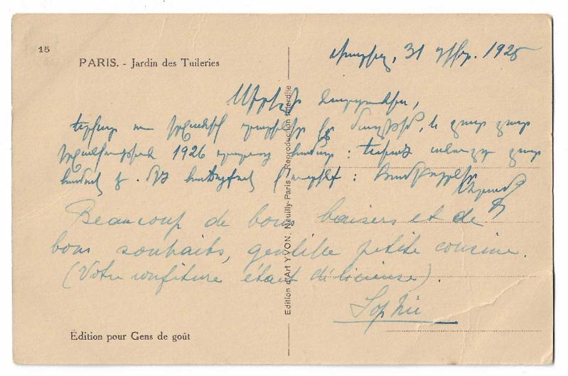 Yeni yıl kartpostalları, Fransızca mutlu yıllar (Heureuse Annee) yazılı, arka yüzünde tebrik mesajı var, 1925 tarihli.