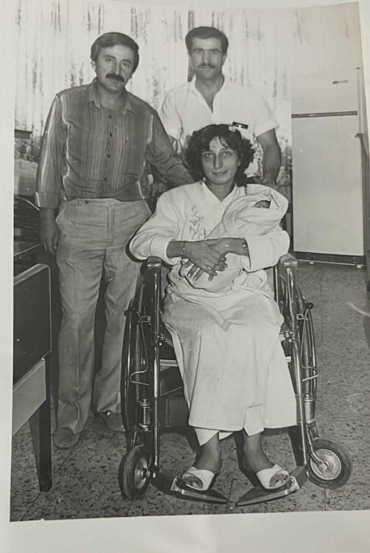 Yeni doğmuş çocuğuyla tekerlekli sandalyeye oturup yakınları ile poz veren yetişkin bir kadın fotoğrafı.ORJİNAL SİYAH & BEYAZ 17x12cm EBADINDA - 1940'LAR, 1950'LER, 1960'LAR ve 1970'LER, en son 11 ay önce güncellenmiştir.