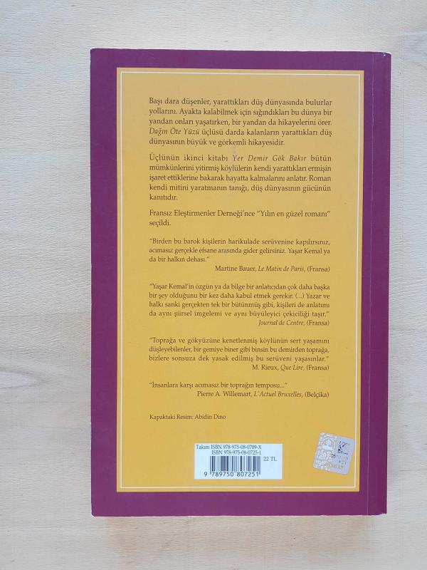 Başı dara düşenler, yarattıkları düş dünyasında bulurlar yollarını. Ayakta kalabilmek için sığındıkları bu dünya bir yandan onları yaşatırken, bir yandan da hikalerini örer. Dağın Öte Yüzü üçlüsü darda kalanların yarattıkları düş dünyasının büyük ve görkemli hikayesidir. Üçlünün ikinci kitabı Yer Demir Gök Bakır bütün mümkünlerini yitirmiş köylülerin kendi yarattıkları ermişin işaret ettiklerine bakarak hayatta kalmalarını anlatır. Roman kendi mitini yaratmanın tanığı, düş dünyasının gücünün kanıtıdır. Fransız Eleştirmenler Derneği'nce Yılın en güzel romanı seçildi. Birden bu barok kişilerin harikulade serüvenine kapılırsınız, acımasız gerçekle efsane arasında gider gelirsiniz. Yaşar Kemal ya da bir halkın dehası. - Tanıtım Metni