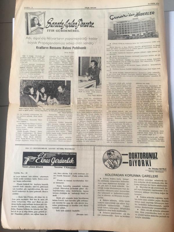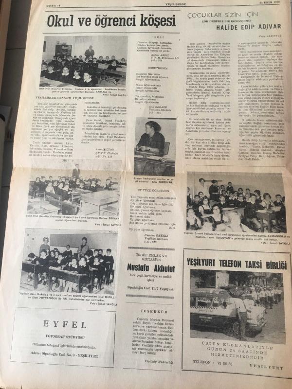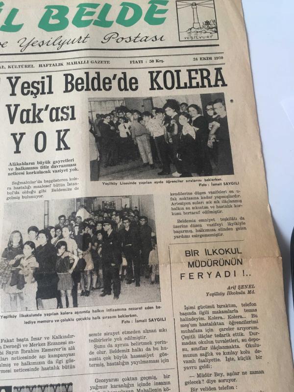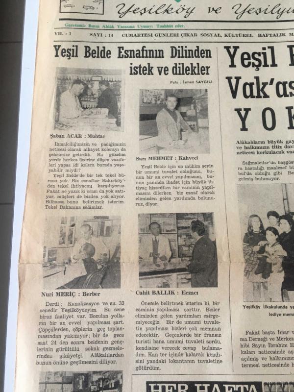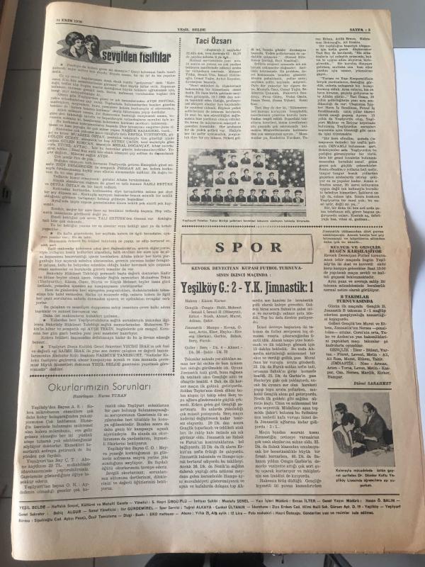 Yeşil Belde -Yeşilköy ve Yeşilyurt Postası -24 Ekim 1970- Yeşi Belde Esnafının Dilinden İstek ve Dilekler -Yeşil Belde ' de KOLERE Vak'ası yok -Bir İlkokul Müdürünün Feryadı Arif Şenel Yeşilköy İlkokulu Mdr- Sanata Açılan Pencere Itır Gürdemirel -Kralların Ressam Rahmi Pehlıvanlı - Doktorunuz Diyor ki -Koleradan Korunma Çareleri dr .Dündar KUTLU - Okurlarımızın Sorunları Taci Özsarı -Sevgiden Fısıltılar -Yeşilköy G:2 - Y.K Jimnastik .1 Yıpranma, sararmalar, kupon kesiği ve yırtılmalar zamana bağlı olarak görülebilir.