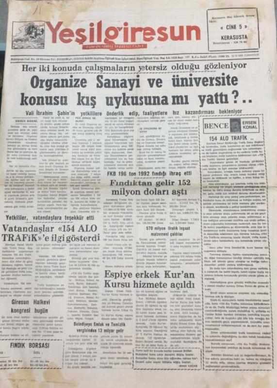 Yeşil Giresun Gazetesi 22 Ekim 1994 Organize Sanayi Ve Üniversite Konusu Kış Uykusuna Mı Yattı? GZ26093, en son 19 gün önce güncellenmiştir.